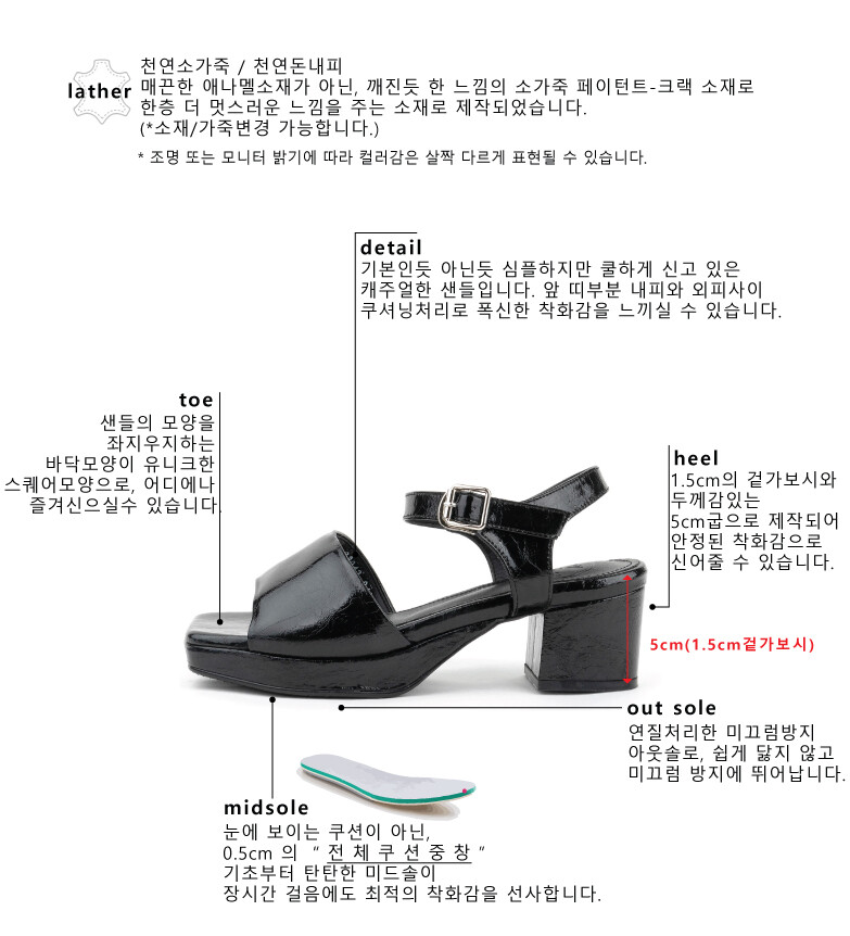 COMMENT 매끈한 애나멜소재가 아닌, 깨진듯 한 느낌의 소가죽 페이턴트-크랙 소재로 한층 더 멋스러운 느낌을 주는 소재로 제작되었습니다. *소재/가죽변경 가능합니다. 샌들의 모양을 좌지우지하는 바닥모양이 유니크한 스퀘어모양으로, 어디에나 즐겨신으실수 있습니다. 기본인듯 아닌듯 심플하지만 쿨하게 신고 있은 캐주얼한 샌들입니다. 앞 띠부분 내피와 외피사이 쿠셔닝처리로 폭신한 착화감을 느끼실 수 있습니다. 1.5cm의 겉가보시와 두께감있는 5cm굽으로 제작되어 안정된 착화감으로 신어줄 수 있습니다. 연질처리한 미끄럼방지 아웃솔로, 쉽게 닳지 않고 미끄럼 방지에 뛰어납니다.