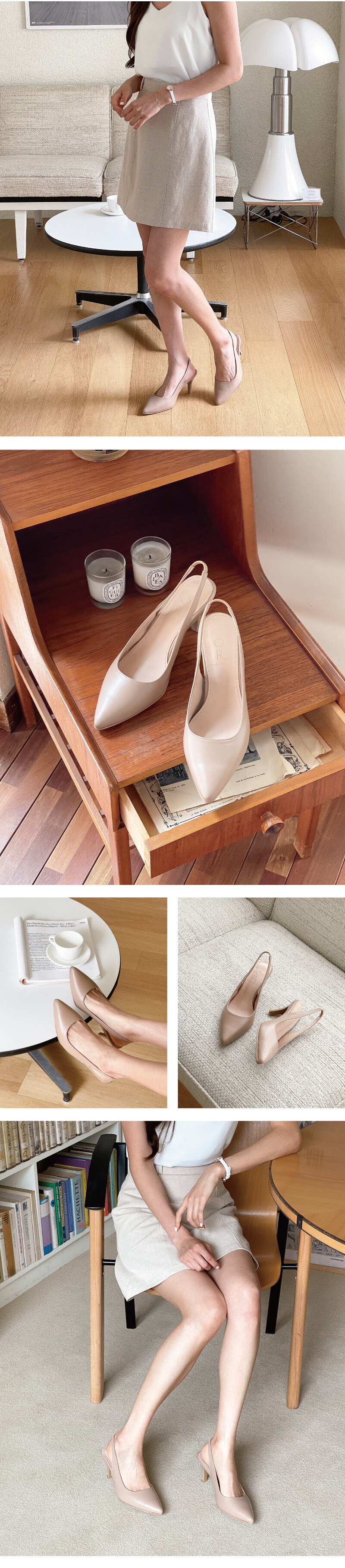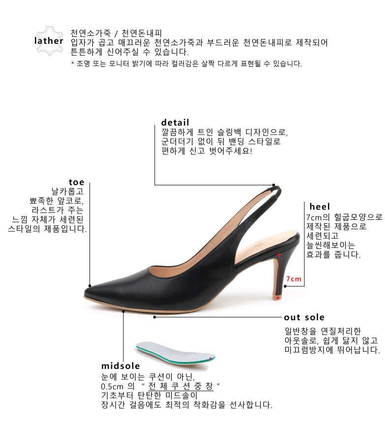 COMMENT 차분한 컬러의 으로 어디에나 여성스럽게 신어줄 슬링백 소개해드립니다! 날렵하고 뾰족한 앞코에 깔끔하게 빠진 슬링백 디자인. 포멀하면서도 세련되게 착화하실 아이템이 되실거에요! 발을 감싸주는 바디는, 매끈하고 튼튼한 천연소가죽으로 내피는 부드러운 천연돈내피로 제작되었습니다. 발뒷꿈치 부분은 밴딩처리로, 신축성 있게 신어주실 수 있습니다.! 삼계절 내내 두루두루 신게 될 슈즈입니다. 밋밋한 옷에는 확실한 임팩트를! 화려한 옷에는 정돈해주는 역할을 할, 슬링백 제품이랍니다. 7cm의 얇은 힐굽 모양으로, 세련되게 착화하실 수 있습니다.