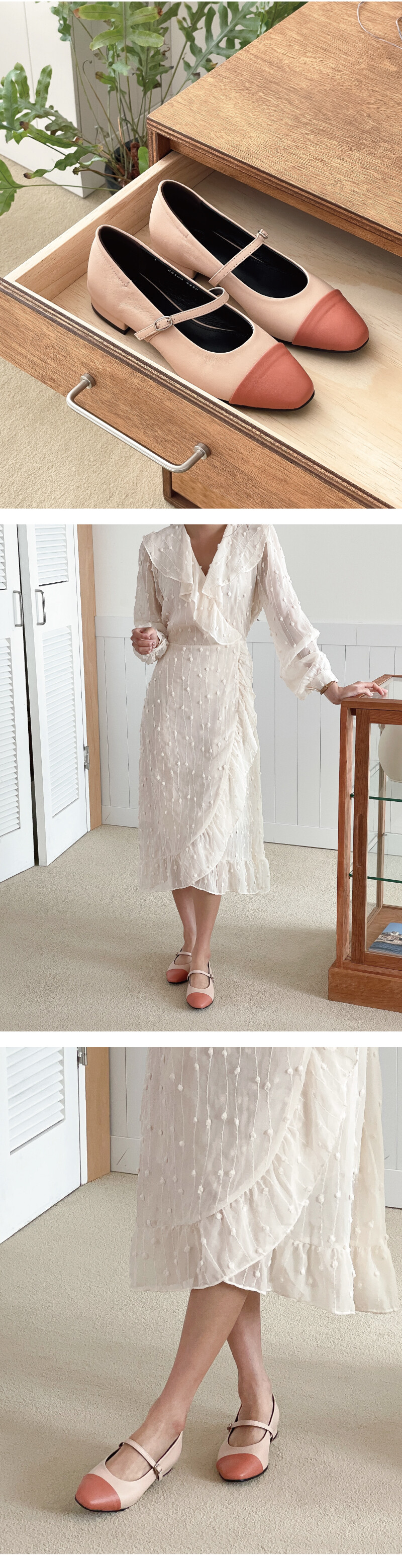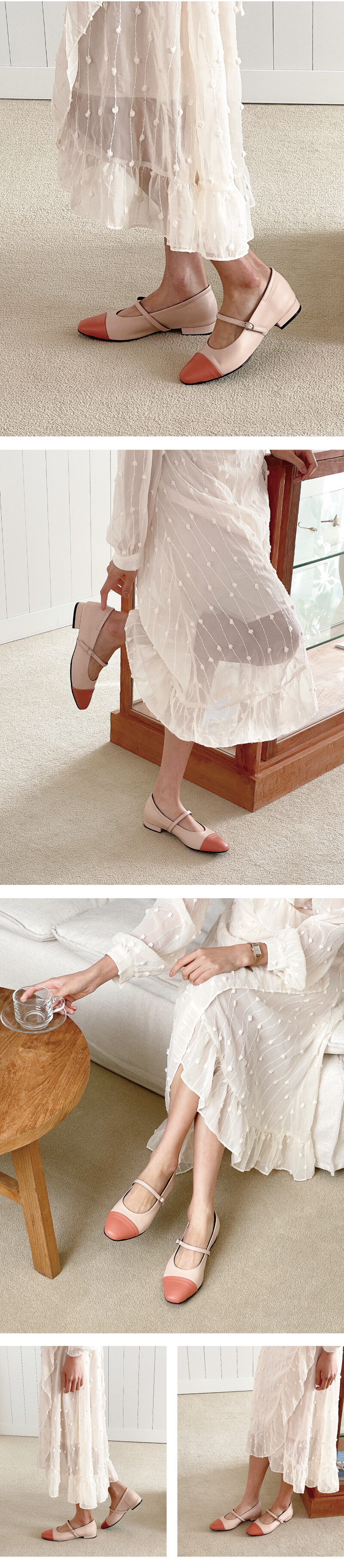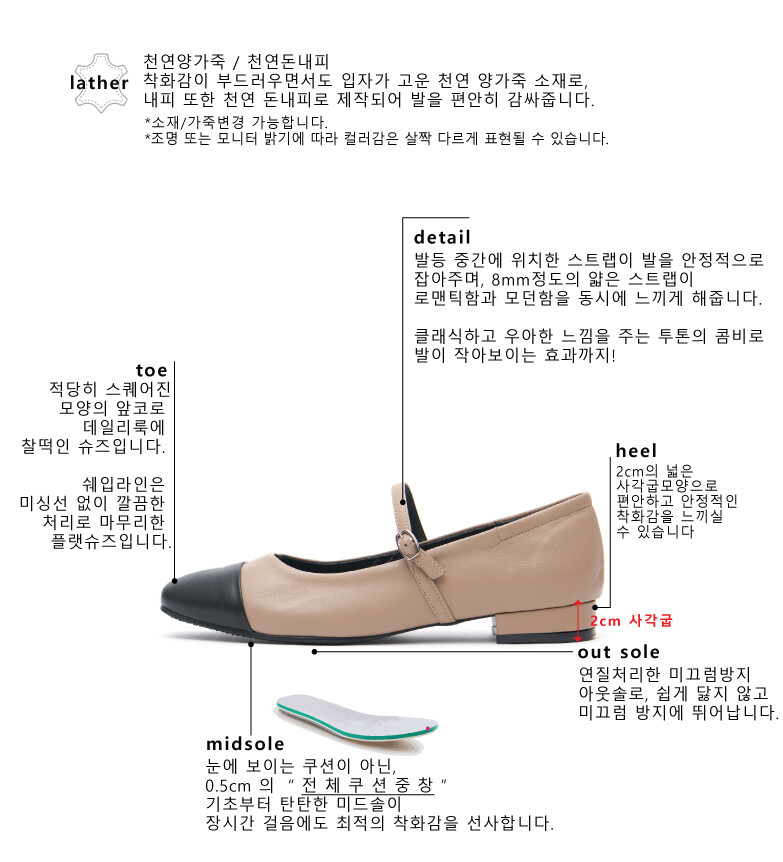 COMMENT 부드러운 양가죽소재와, 적당히 스퀘어진 앞코, 투톤의 콤비로#데일리슈즈로 즐겨신으실 수 있는메리제인 소개해드립니다 : )착화감이 부드러우면서도 입자가 고운 천연 양가죽 소재로, 내피 또한 천연 돈내피로 제작되어 발을 편안히 감싸줍니다. 적당히 스퀘어진 모양의 앞코로 데일리룩에 찰떡인 슈즈입니다. 쉐입라인은 미싱선 없이 깔끔한 처리로 마무리한 플랫슈즈입니다.발등 중간에 위치한 스트랩이 발을 안정적으로 잡아주며, 8mm정도의 얇은 스트랩이 로맨틱함과 모던함을 동시에 느끼게 해줍니다. 클래식하고 우아한 느낌을 주는 투톤의 콤비로 발이 작아보이는 효과까지! 뒷꿈치부분 외피와 내피사이에 일반적으로 들어가는 보형물(월형)을 쓰지 않고, 스폰지보형물과 밴딩처리로 대체하여 부드럽고 말랑하게 신어주 실 수 있습니다. 2cm의 넓은 사각굽모양으로 편안하고 안정적인 착화감을 느끼실 수 있습니다. 일반창을 연질처리한 아웃솔로, 쉽게 닳지 않고 미끄럼방지에 뛰어납니다.