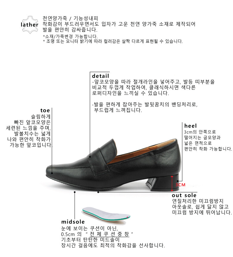 COMMENT 세련된 앞코와, 부드럽게 잡아주는 양가죽소재로 편하게 즐겨주세요 : ) 착화감이 부드러우면서도 입자가 고운 천연 양가죽 소재로 제작외어 발을 편안히 감싸줍니다. 슬림하게 빠진 앞코모양은 세련된 느낌을 주며, 발볼치수는 넓게 나와 편안히 착화가 가능한 앞코입니다. 앞코모양을 따라 절개라인을 넣어주고, 발등 띠부분을 비교적 두껍게 작업하여, 클래식하시면 색다른 로퍼디자인을 느끼실 수 있습니다. 발을 편하게 잡아주는 발뒷꿈치의 밴딩처리로, 부드럽게 느껴집니다. 3cm의 안쪽으로 떨어지는 굽모양과 넓은 면적으로 편안히 착화 가능합니다. 미끄럼방지 아웃솔 연질처리된 바닥창으로, 쉽게 닳지 않고 미끄럼방지에 뛰어납니다.