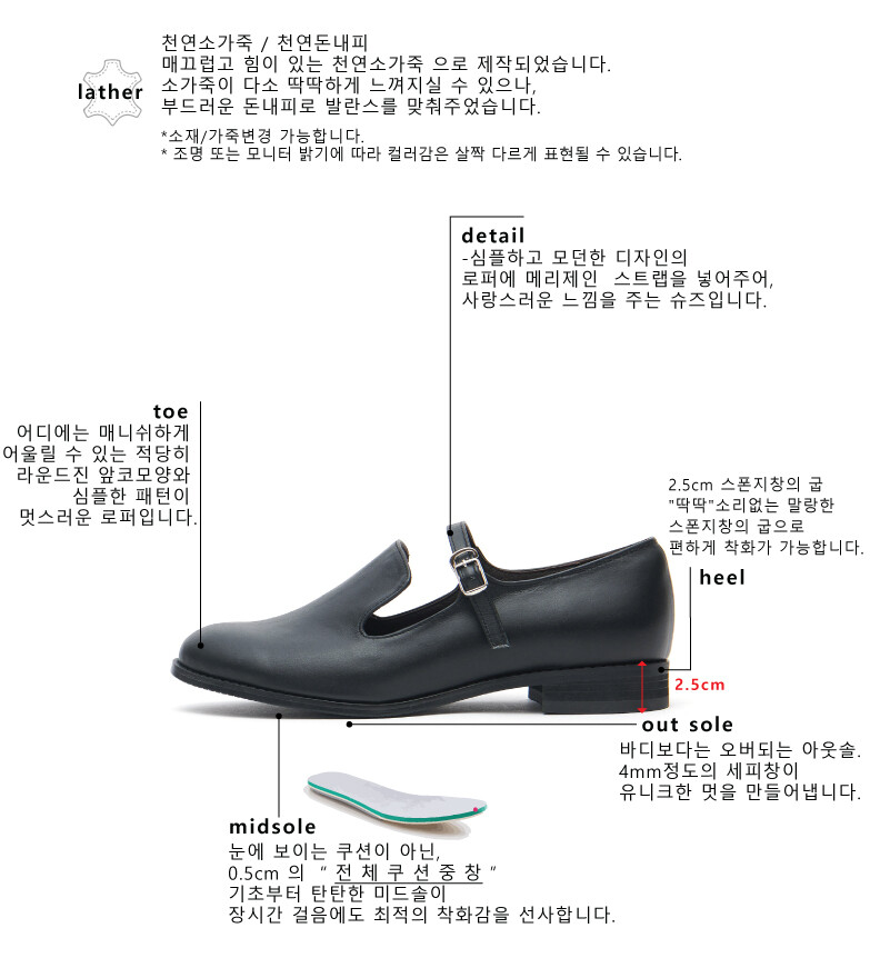 COMMENT 깔끔한 로퍼에 메리제인 스트랩을 추가해주어, 사랑스럽게! 매끄럽고 힘이 있는 천연소가죽 으로 제작되었습니다. 소가죽이 다소 딱딱하게 느껴지실 수 있으나, 부드러운 돈내피로 발란스를 맞춰주었습니다. *부드러운 가죽을 원하시는 분들은 소재변경이 가능하오니 문의해주세요. 어디에는 매니쉬하게 어울릴 수 있는 적당히 라운드진 앞코모양와 심플한 패턴이 멋스러운 로퍼입니다. 심플하고 모던한 디자인의 로퍼에 메리제인 스트랩을 넣어주어, 사랑스러운 느낌을 주는 슈즈입니다. 2.5cm 스폰지창의 굽 "딱딱"소리없는 말랑한 스폰지창의 굽으로 편하게 착화가 가능합니다. 바디보다는 오버되는 아웃솔. 4mm정도의 세피창이 유니크한 멋을 만들어냅니다.
