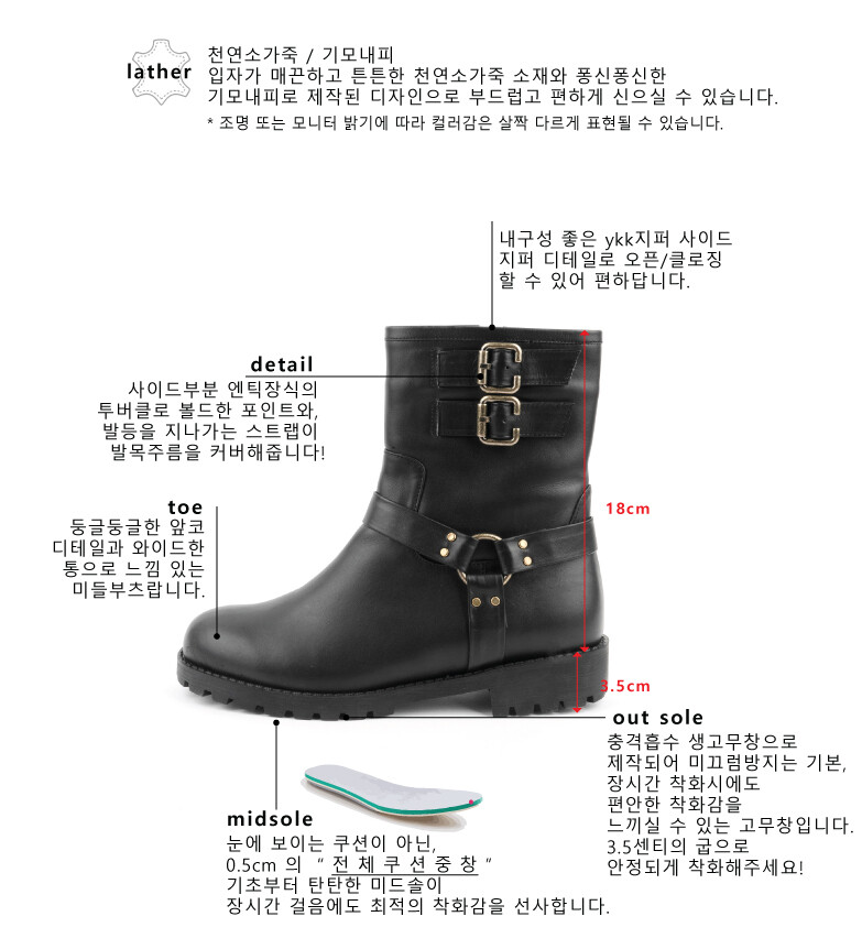 COMMENT 사이드 부분 엔틱장식으로 볼드한 포인트를 준 앵클부츠를 소개해드려요 :) 입자가 매끈하고 튼튼한 천연소가죽 소재와 퐁신퐁신한 기모내피로 제작된 디자인으로 부드럽고 편하게 신으실 수 있습니다. 앵클부츠에서 살짝 올라가는 굽제외 18cm의 총기장으로 캐주얼하고 세련된 느낌으로 착화해주세요! (*235사이즈 기준이므로 약간의 오차는 있을 수 있으니 참고해 주세요) 둥글둥글한 앞코 디테일과 와이드한 통으로 신어주실 수 있는 하프 부츠입니다. *사람마다 다른 다리둘레는 다리사이즈에 맞게 수정도 가능하오니, 둘레가 얇거나 크신분들은 제작요청해주시면 참고해서 제작해드리겠습니다. *보통체격의 분들은 견본대로 제작하시실 추천드립니다. 사이드부분 엔틱장식의 투버클로 볼드한 포인트와, 발등을 지나가는 스트랩이 발목주름을 커버해줍니다! 내구성 좋은 ykk지퍼 사이드 지퍼 디테일로 오픈/클로징 할 수 있어 편하답니다. 충격흡수 생고무창 으로 제작되어 미끄럼방지는 기본, 장시간 착화시에도 편안한 착화감을 느끼실 수 있는 고무창입니다. 3.5센티의 굽으로 안정되게 착화해주세요!