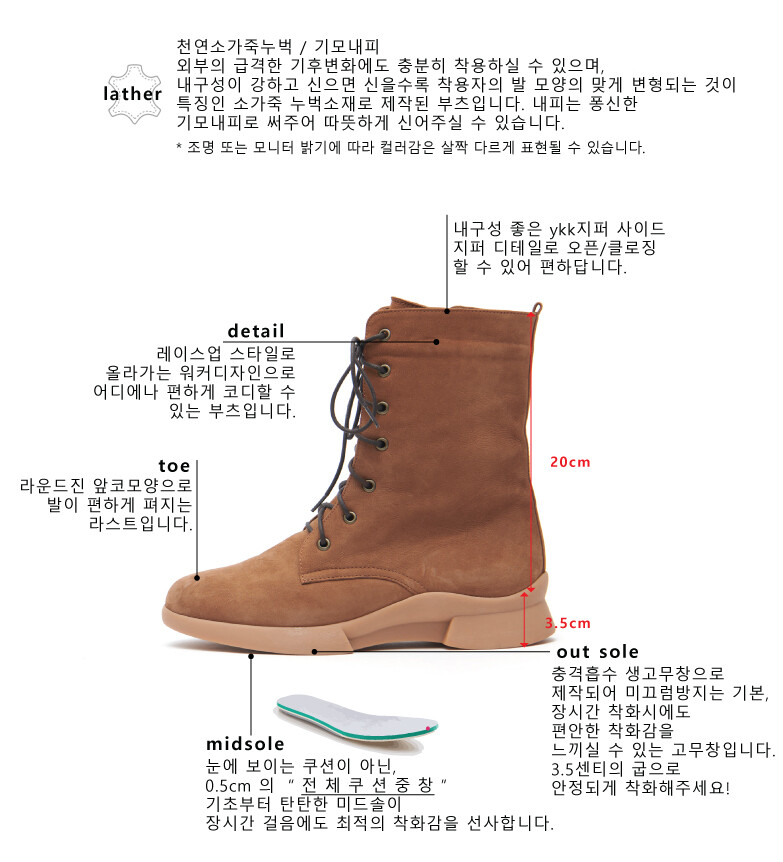 COMMENT 부드럽고 포근하게 신어주실 수 있는 레이스업 스니커즈부츠를소개해드려요 :) 외부의 급격한 기후변화에도 충분히 착용하실 수 있으며, 내구성이 강하고 신으면 신을수록 착용자의 발 모양의 맞게 변형되는 것이 특징인 소가죽 누벅소재로 제작된 부츠입니다. 내피는 퐁신한 기모내피로 써주어 따뜻하게 신어주실 수 있습니다. 부츠 총기장(굽 제외) 20cm의 기장감으로 제작되었어요. (*235사이즈 기준이므로 약간의 오차는 있을 수 있으니 참고해 주세요) 사람마다 다른 다리둘레는 다리사이즈에 맞게 수정도 가능하오니, 둘레가 얇거나 크신분들은 제작요청해주시면 참고해서 제작해드리겠습니다. 보통체격의 분들은 견본대로 제작하시실 추천드립니다. 라운드진 앞코모양으로 발이 편하게 펴지는 라스트입니다. 레이스업 스타일로 올라가는 워커디자인으로 어디에나 편하게 코디할 수 있어요! 내구성 좋은 ykk지퍼 사이드 지퍼 디테일로 오픈/클로징 할 수 있어 편하답니다. 3.5센티의 충격흡수 생고무창으로 제작되어 미끄럼 방지는 기본, 장시간 착화 시에도 편안한 착화감을 느끼실 수 있는 고무창입니다.