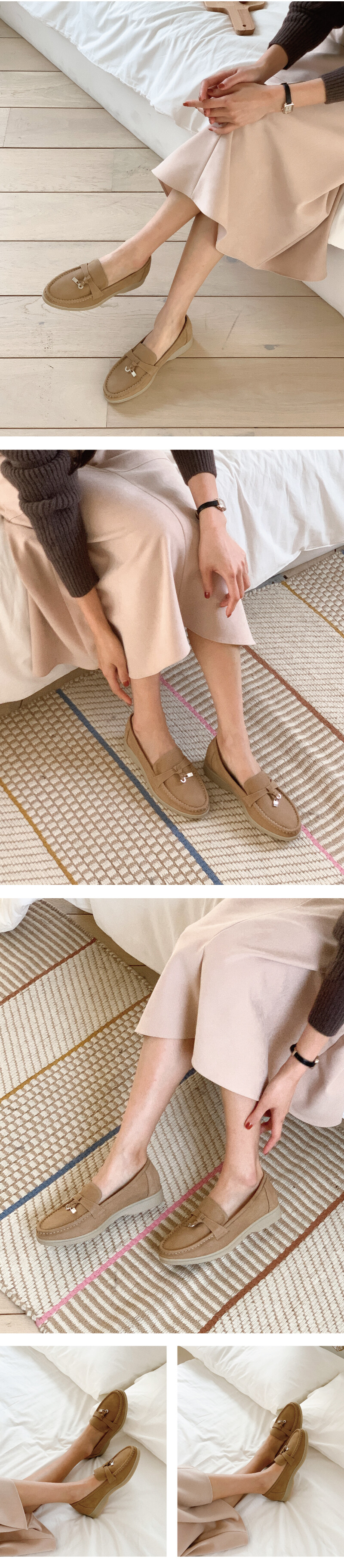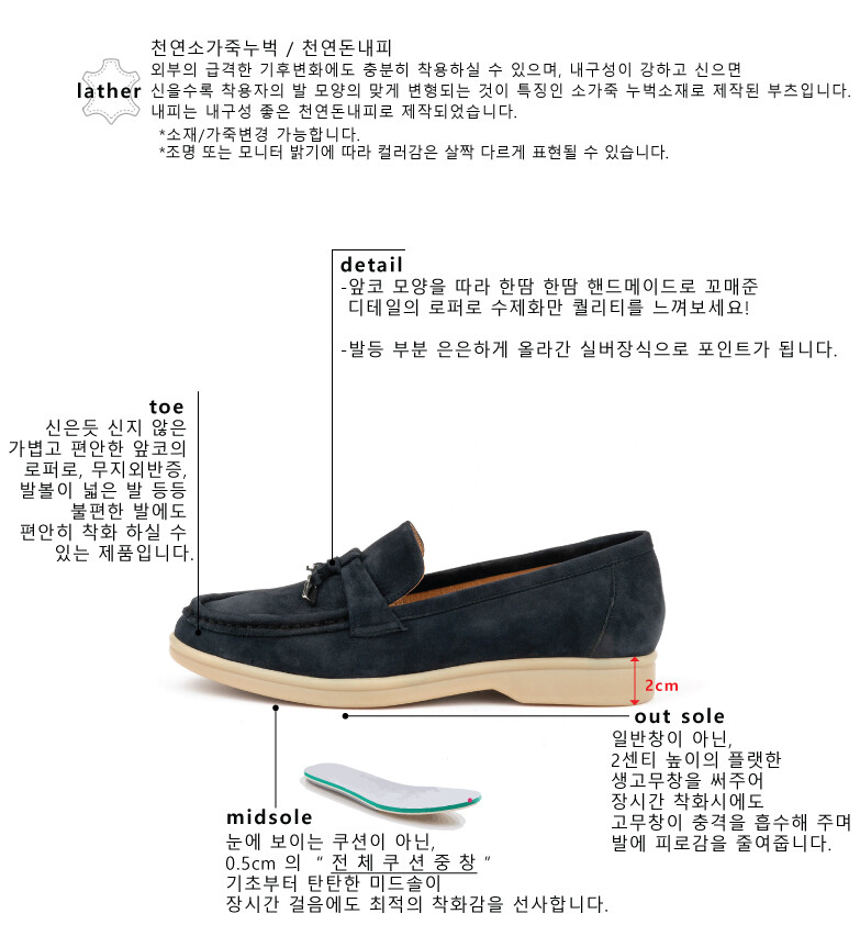COMMENT 발등에 들어간 작은 실버 장식이 포인트가 되는 로퍼를 소개해드려요. 신은듯 신지 않은 가볍고 편안한 앞코의 로퍼로, 무지외반증, 발볼이 넓은 발 등등 불편한 발에도 편안히 착화 하실 수 있는 제품입니다. 외부의 급격한 기후변화에도 충분히 착용하실 수 있으며, 내구성이 강하고 신으면 신을수록 착용자의 발 모양의 맞게 변형되는 것이 특징인 소가죽 누벅소재로 제작된 로퍼입니다. 내피는 내구성 좋은 천연돈내피로 제작되었습니다. 앞코 모양을 따라 한땀 한땀 핸드메이드로 꼬매준 디테일의 로퍼로 수제화만 퀄리티를 느껴보세요! 계절을 타지 않으며, 4계절 내내 오래두고 신으실 수 있는 디자인으로 편안함은 기본! 데일리룩에도 잘 어우실 고급스럽고 착화감 좋은 상품으로 강추해드립니다!