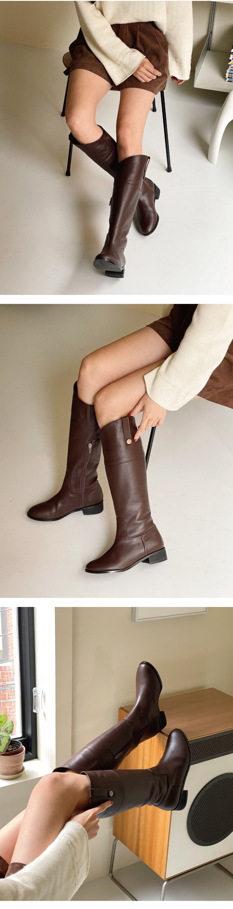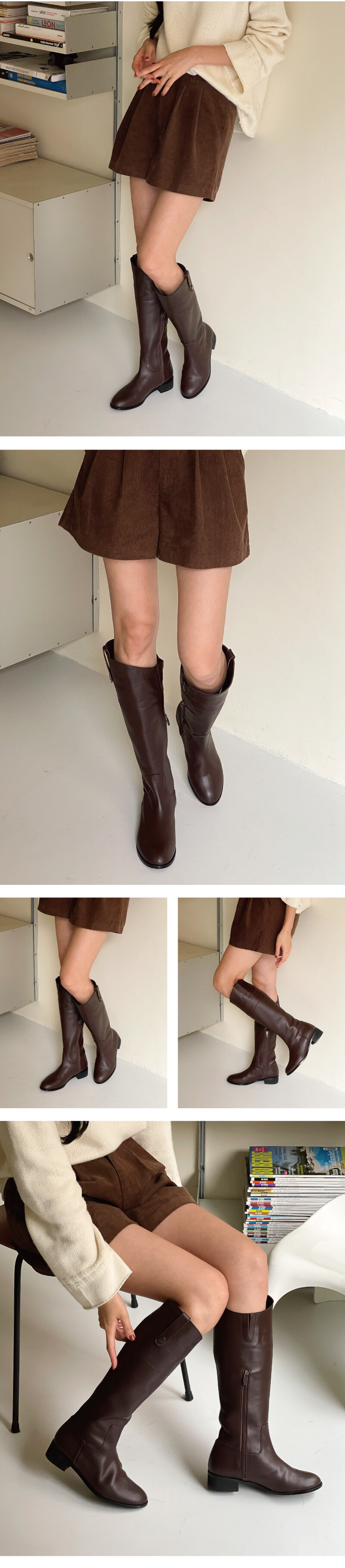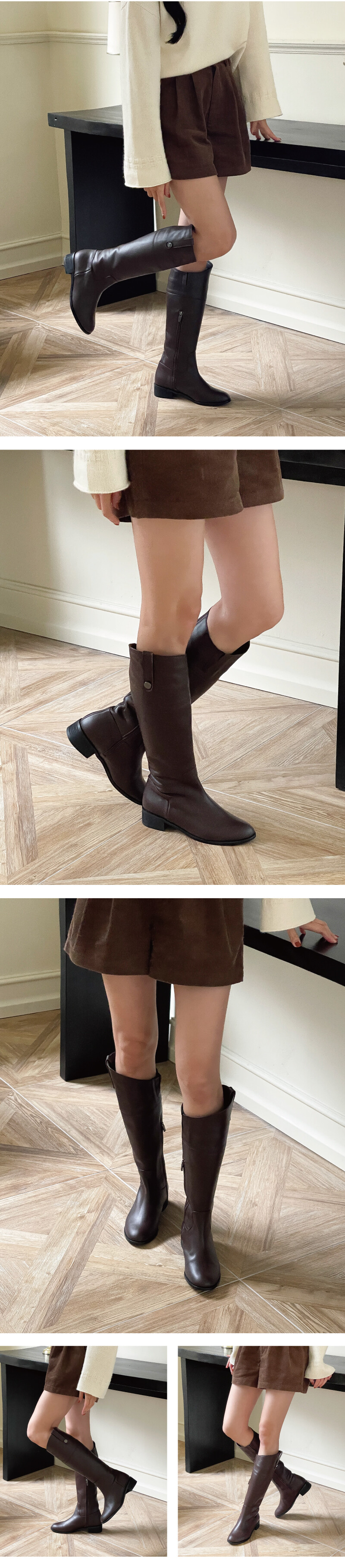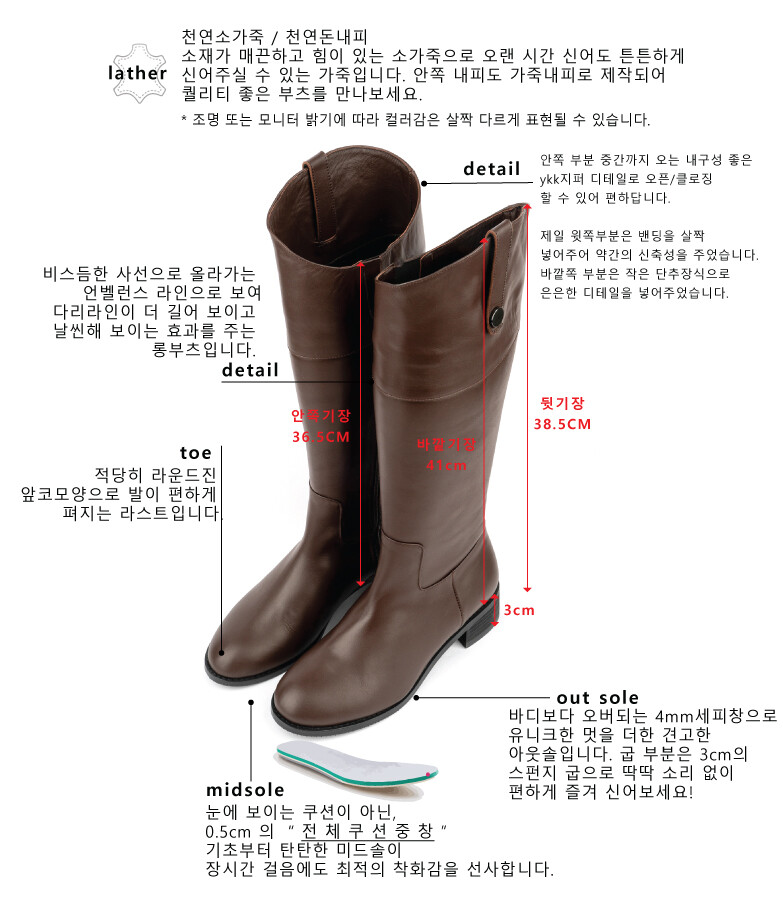 COMMENT 소재가 매끈하고 힘이 있는 소가죽으로 오랜 시간 신어도 튼튼하게 신어주실 수 있는 가죽입니다. 안쪽 내피도 가죽내피로 제작되어 퀄리티 좋은 부츠를 만나보세요. 뒤 기장, 안쪽 기장, 바깥 기장 비스듬한 사선 라인으로 떨어지는 롱부츠로 뒤 기장 총 38.5cm / 안쪽 기장 36.5cm / 바깥 기장 41cm로 제작된 상품입니다. 사람마다 다른 다리 기장으로 다리 사이즈 체크 후 제작해 드리고 있습니다. (*부츠 통이나 기장은 기준점이 넘어갈 경우 추가요금이 발생합니다.) 비스듬한 사선으로 올라가는 언벨런스 라인으로 보여 다리라인이 더 길어 보이고 날씬해 보이는 효과를 주는 롱부츠입니다. 안쪽 부분 중간까지 오는 내구성 좋은 ykk지퍼 디테일로 오픈/클로징 할 수 있어 편하답니다. 제일 윗쪽부분은 밴딩을 살짝 넣어주어 약간의 신축성을 주었습니다. 바깥쪽 부분은 작은 단추장식으로 은은한 디테일을 넣어주었습니다. 적당히 라운드진 앞코모양으로 발이 편하게 펴지는 라스트입니다. 바디보다 오버되는 4mm세피창으로 유니크한 멋을 더한 견고한 아웃솔입니다. 굽 부분은 3cm의 스펀지 굽으로 딱딱 소리 없이 편하게 즐겨 신어보세요!