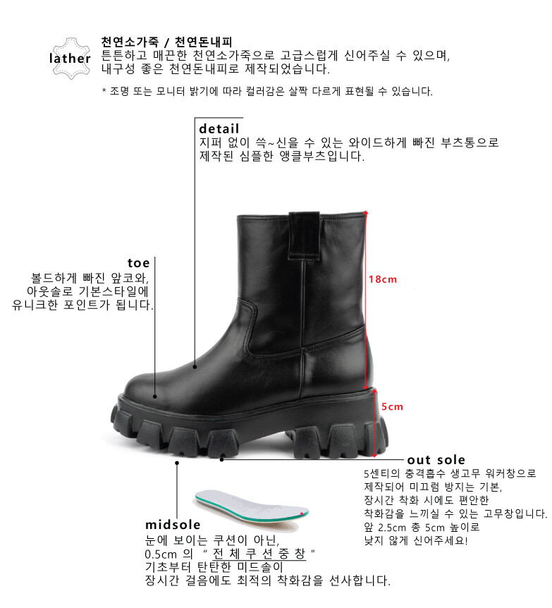 COMMENT 심플하게 올라가는 통부츠, 볼드한 아웃솔로 유니크하게! 튼튼하고 매끈한 천연소가죽으로 고급스럽게 신어주실 수 있으며, 내구성 좋은 천연돈내피로 제작되었습니다. 18cm의 기본총기장!(굽제외) 235사이즈 기준, 18센티의 총기장으로 가을겨울 편하게 즐겨 신어보세요. 매끈하고 심플한 스타일의 앵클부츠로 멋스럽게 즐겨보세요. *사람마다 다른 다리둘레는 다리사이즈에 맞게 수정도 가능하오니, 둘레가 얇거나 크신분들은 제작요청해주시면 참고해서 제작해드리겠습니다. *보통체격의 분들은 견본대로 제작하시실 추천드립니다. 볼드하게 빠진 앞코와, 아웃솔로 기본스타일에 유니크한 포인트가 됩니다. 지퍼 없이 쓱~신을 수 있는 와이드하게 빠진 부츠통으로 제작된 심플한 앵클부츠입니다. 5센티의 충격흡수 생고무 워커창 으로 제작되어 미끄럼 방지는 기본, 장시간 착화 시에도 편안한 착화감을 느끼실 수 있는 고무창입니다. 앞 2.5cm 총 5cm 높이로 낮지 않게 신어주세요!