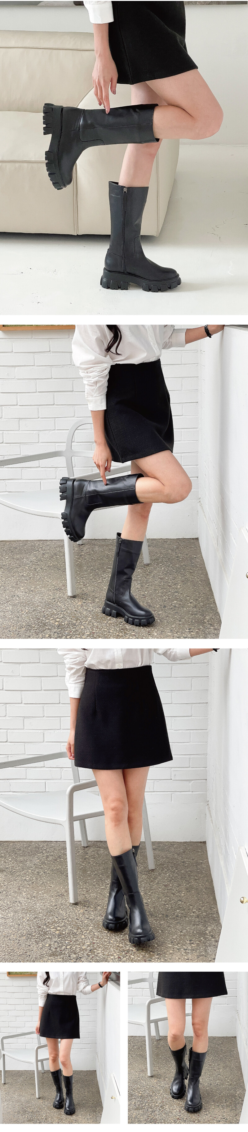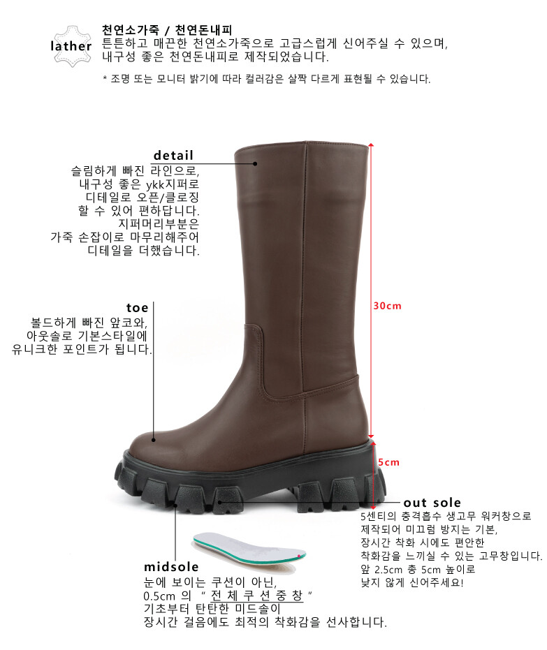 COMMENT 심플하고 슬림하게 올라가는 하프부츠, 볼드한 아웃솔로 유니크하게! 튼튼하고 매끈한 천연소가죽으로 고급스럽게 신어주실 수 있으며, 내구성 좋은 천연돈내피로 제작되었습니다. 30cm의 하프기장의 부츠!(굽제외) 235사이즈 기준, 30센티의 총기장으로 가을겨울 편하게 즐겨 신어보세요. 매끈하고 심플한 스타일의 앵클부츠로 멋스럽게 즐겨보세요. *사람마다 다른 다리둘레는 다리사이즈에 맞게 수정도 가능하오니, 둘레가 얇거나 크신분들은 제작요청해주시면 참고해서 제작해드리겠습니다. *보통체격의 분들은 견본대로 제작하시실 추천드립니다. 볼드하게 빠진 앞코와, 아웃솔로 기본스타일에 유니크한 포인트가 됩니다. 슬림하게 빠진 라인으로, 내구성 좋은 ykk지퍼 사이드 지퍼 디테일로 오픈/클로징 할 수 있어 편하답니다. 지퍼머리부분은 가죽 손잡이로 마무리해주어 디테일을 더했습니다. 5센티의 충격흡수 생고무 워커창 으로 제작되어 미끄럼 방지는 기본, 장시간 착화 시에도 편안한 착화감을 느끼실 수 있는 고무창입니다. 앞 2.5cm 총 5cm 높이로 낮지 않게 신어주세요!