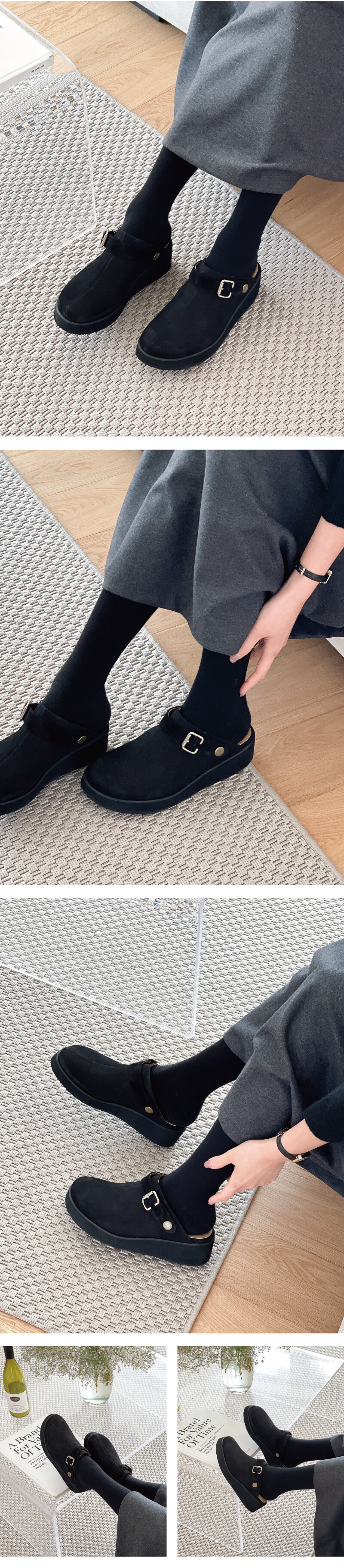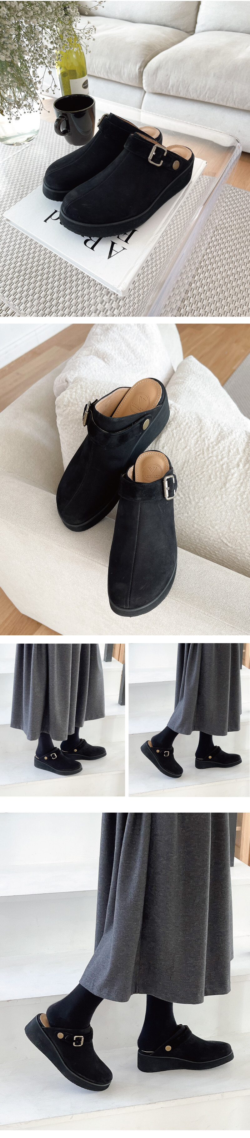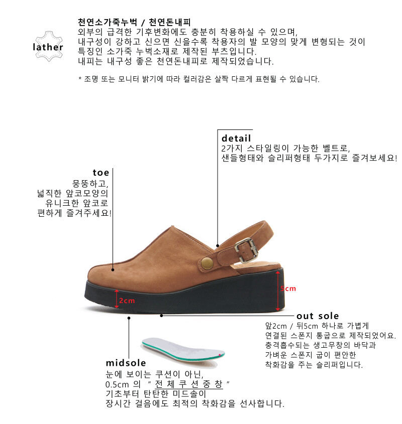 COMMENT 부드럽고 따뜻한 고급소재의 천연소가죽으로 제작된 슬리퍼뮬을소개해드립니다 : ) 외부의 급격한 기후변화에도 충분히 착용하실 수 있으며, 내구성이 강하고 신으면 신을수록 착용자의 발 모양의 맞게 변형되는 것이 특징인 소가죽 누벅소재로 제작된 부츠입니다. 내피는 내구성 좋은 천연돈내피로 제작되었습니다. 뭉뚱하고, 넓직한 앞코모양의 유니크한 앞코로 편하게 즐겨주세요! 2가지 스타일링이 가능한 벨트로, 샌들형태와 슬리퍼형태 두가지로 즐겨보세요! 앞2cm / 뒤5cm 하나로 가볍게 연결된 스폰지 통굽으로 제작되었어요. 충격흡수되는 생고무창의 바닥과 가벼운 스폰지 굽이 편안한 착화감을 주는 슬리퍼입니다.
