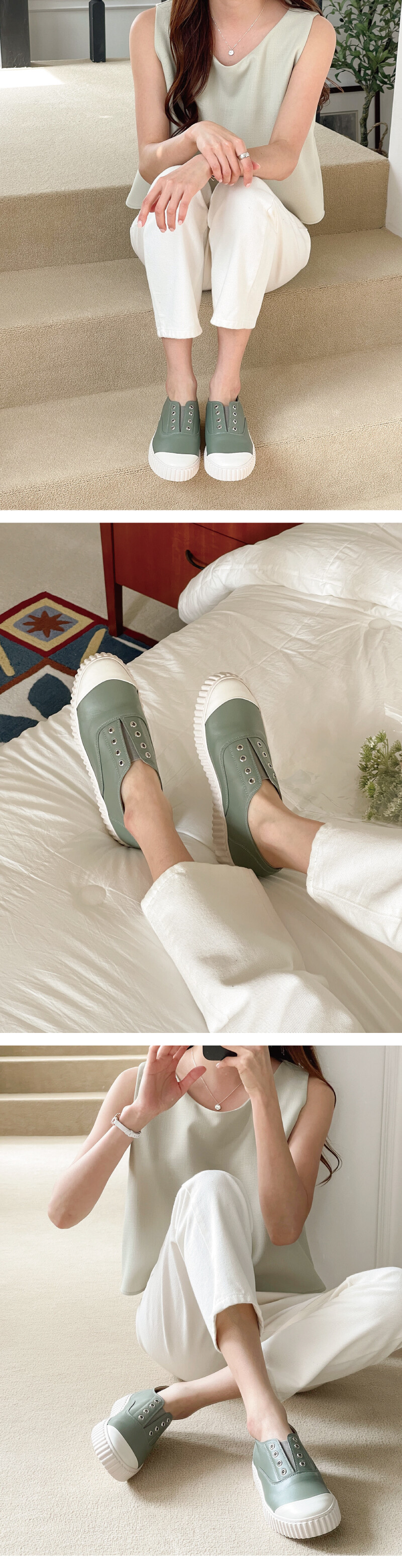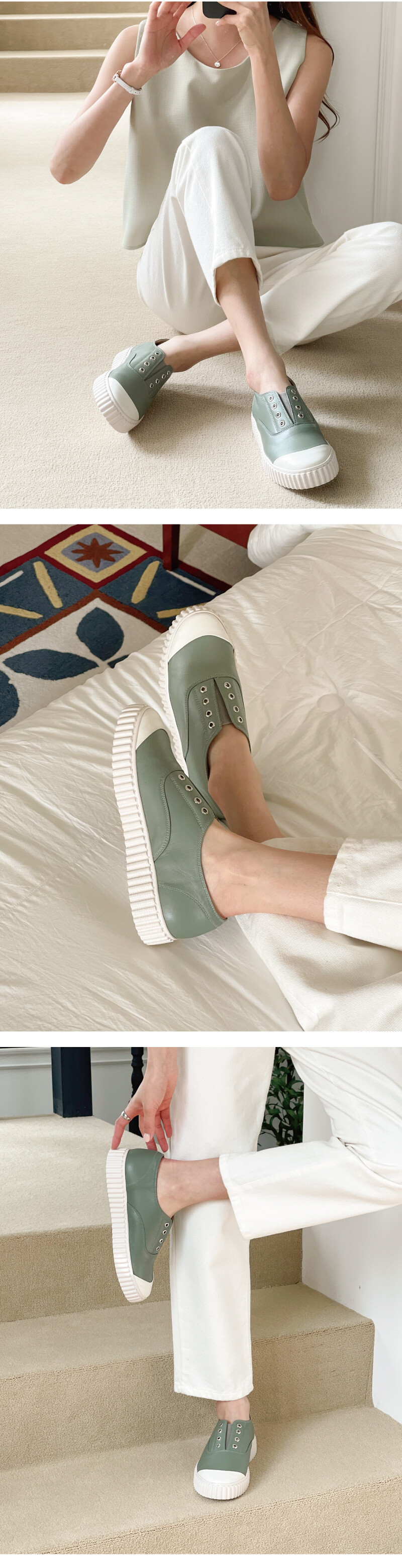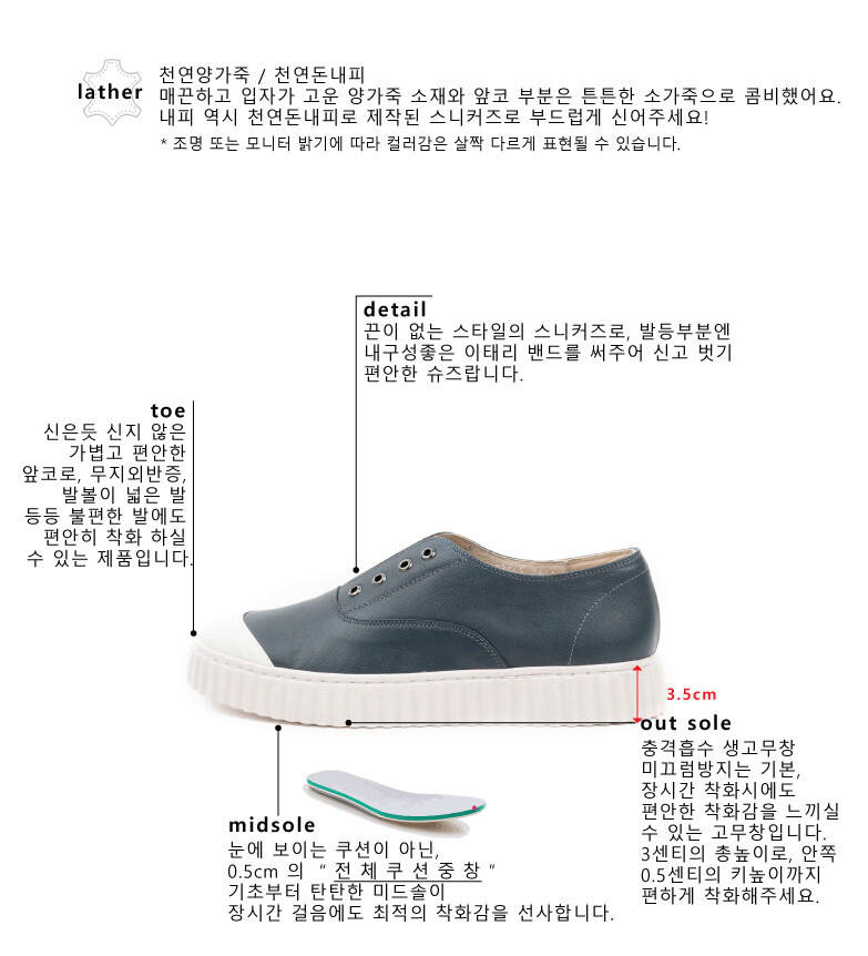 COMMENT 발등을 짱짱하게 잡아주는 밴딩처리,끈이 없는 스니커즈 스타일로 편하게 신고 벗으실 수 있는 스니커즈를 소개해드려요! 매끈하고 입자가 고운 양가죽 소재와 앞코 부분은 튼튼한 소가죽으로 콤비했어요. 내피 역시 천연돈내피로 제작된 스니커즈로 부드럽게 신어주세요! 신은듯 신지 않은 가볍고 편안한 앞코로, 무지외반증, 발볼이 넓은 발 등등 불편한 발에도 편안히 착화 하실 수 있는 제품입니다. 끈이 없는 스타일의 스니커즈로, 발등부분엔 내구성좋은 이태리 밴드를 써주어 신고 벗기 편안한 슈즈랍니다. 충격흡수 생고무창 미끄럼방지는 기본, 장시간 착화시에도 편안한 착화감을 느끼실 수 있는 고무창입니다. 3센티의 총높이로, 안쪽 0.5센티의 키높이까지 편하게 착화해주세요.