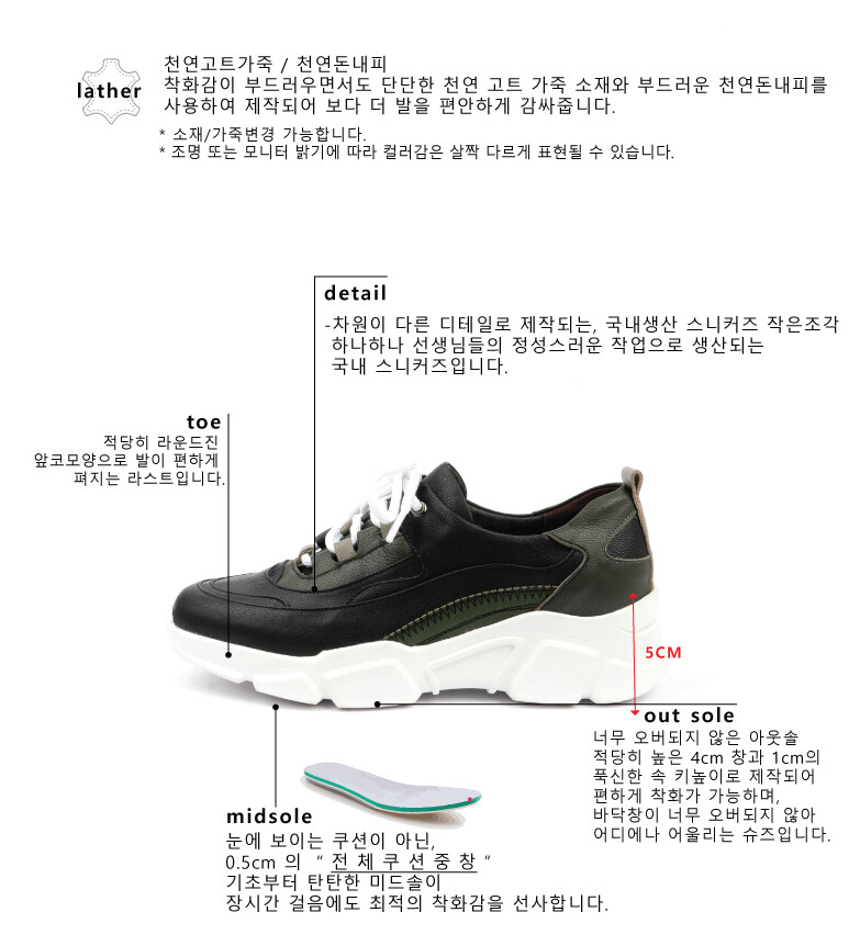 COMMENT 부드러운 고트가죽과, 천연돈내피로 제작된 퀄리티 높은 스니커즈를 소개합니다. 착화감이 부드러우면서도 단단한 천연 고트 가죽 소재와 부드러운 천연돈내피를 사용하여 제작되어 보다 더 발을 편안하게 감싸줍니다. 적당히 라운드진 앞코모양으로 발이 편하게 펴지는 라스트입니다. 차원이 다른 디테일로 제작되는, 국내생산 스니커즈 작은조각 하나하나 선생님들의 정성스러운 작업으로 생산되는 국내 스니커즈입니다. 너무 오버되지 않은 아웃솔 적당히 높은 4cm 창과 1cm의 푹신한 속 키높이로 제작되어 편하게 착화가 가능하며, 바닥창이 너무 오버되지 않아 슬랙스,청바지, 원피스 등등 어디에나 어울리는 데일리슈즈입니다.