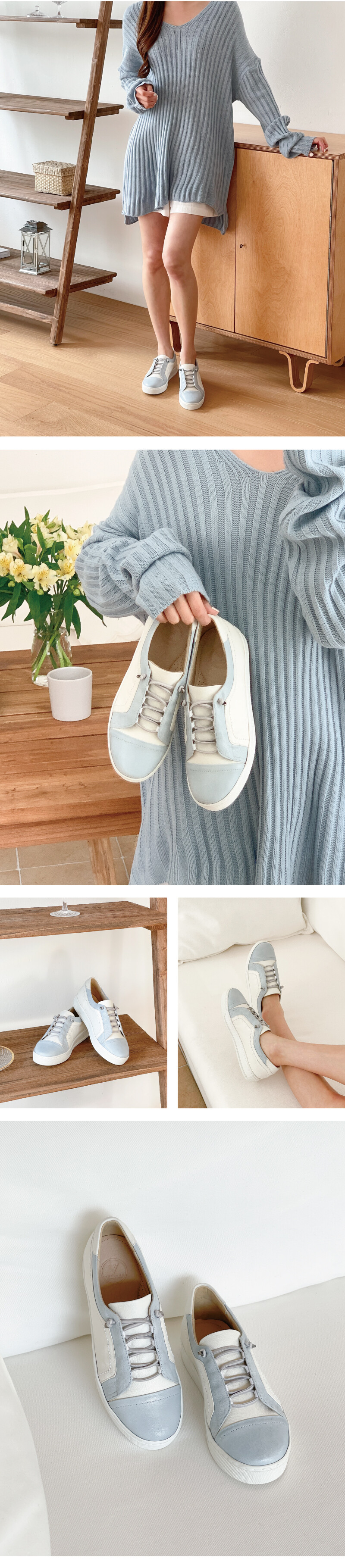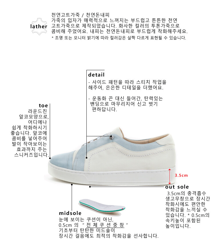 COMMENT 디자인의 세련됨과 쿨한 맛이 동시에 느껴지는 콤비 스니커즈입니다. 청량감이 느껴지는 블루컬러와, 기본이 되는 은은한 베이지컬러 두가지로 준비했습니다. 발등 부분 일반적인 운동화끈이 아닌, 탄력있는 고무밴딩으로 마무리 해주어 착화하실 때도 편하게 신어주실 수 있습니다. 사이드 패턴을 따라 스티치 작업을 해주어, 은은한 디테일을 더했어요. 어떤 스타일로 코디하느냐에 따라 캐주얼+포멀하게 스타일 폭이 넓은 아이템으로 즐겨신어주세요! 가죽의 입자가 매력적으로 느껴지는 부드럽고 튼튼한 천연 고트가죽으로 제작되었습니다. 화사한 컬러의 투톤가죽으로 콤비해 주었어요. 내피는 천연돈내피로 부드럽게 느껴집니다. 3.5cm의 충격흡수 생고무창으로 장시간 착화시에도 편안한 착화감을 느끼실 수 있습니다. * 0.5cm의 속키높이 포함된 높이입니다.