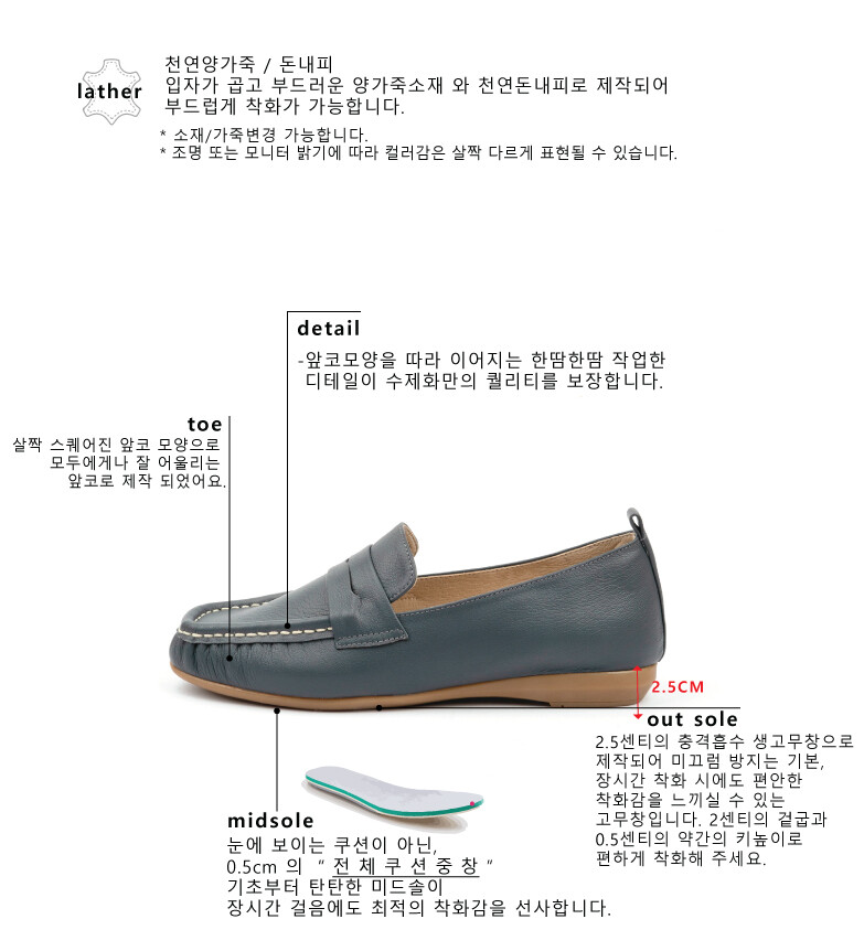 COMMENT 담백하게 신어줄 수 있는 컴포트한 로퍼를 소개합니다 :) 입자가 곱고 부드러운 양가죽소재 와 천연돈내피로 제작되어 부드럽게 착화가 가능합니다. 살짝 스퀘어진 앞코 모양으로 모두에게나 잘 어울리는 앞코로 제작 되었어요. 앞코모양을 따라 이어지는 한땀한땀 작업한 디테일이 수제화만의 퀄리티를 보장합니다. 2.5센티의 충격흡수 생고무창으로 제작되어 미끄럼 방지는 기본, 장시간 착화 시에도 편안한 착화감을 느끼실 수 있는 고무창입니다. 2센티의 겉굽과 0.5센티의 약간의 키높이로 편하게 착화해 주세요.