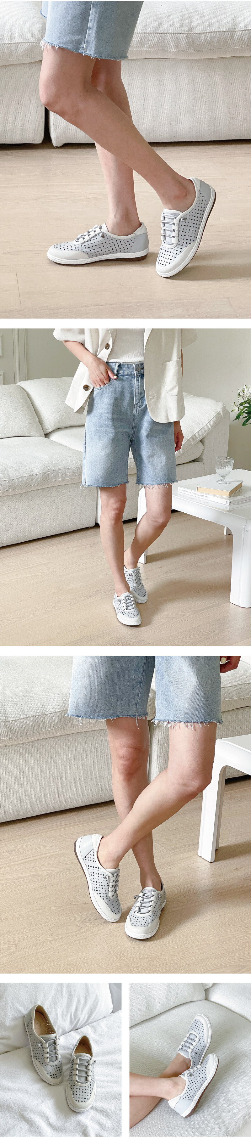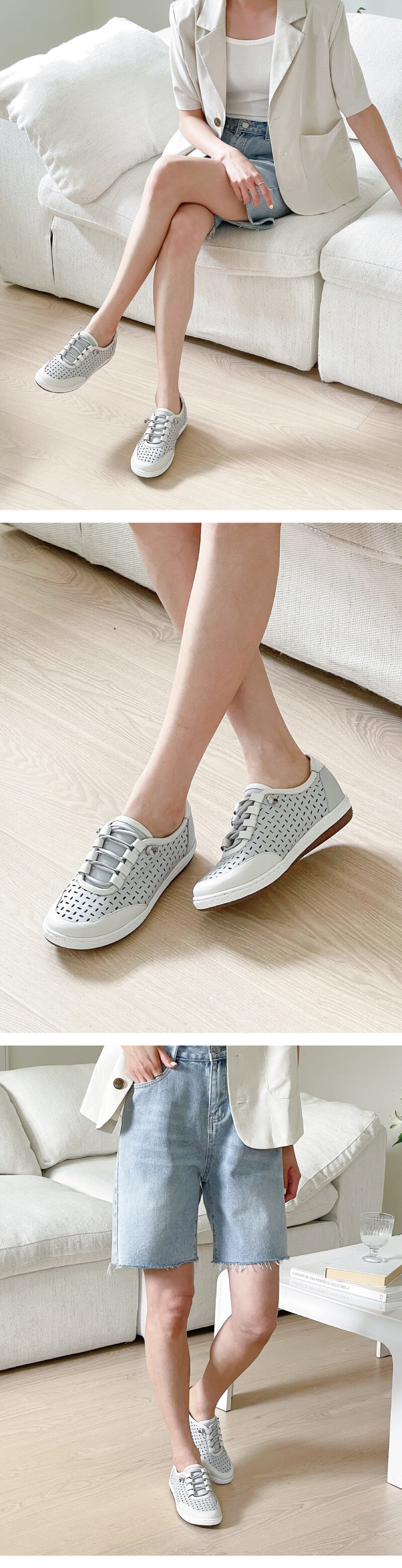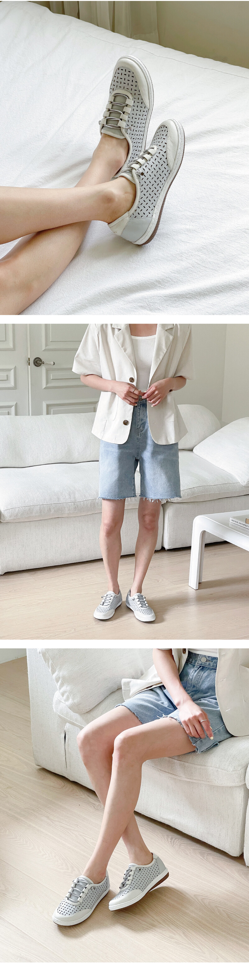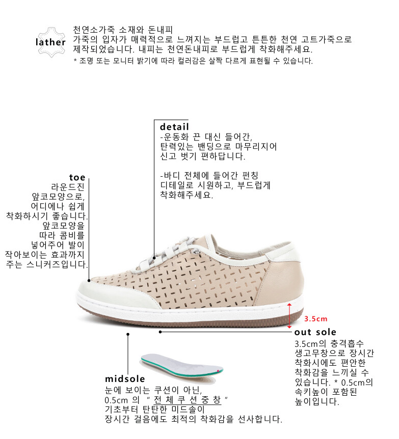 COMMENT 밴딩처리로 마무리한 시원한 스니커즈를 소개해드려요 : ) ! 가죽의 입자가 매력적으로 느껴지는 부드럽고 튼튼한 천연 고트가죽으로 제작되었습니다. 내피는 천연돈내피로 부드럽게 착화해주세요. 라운드진 앞코모양으로, 어디에나 쉽게 착화하시기 좋습니다. 앞코모양을 따라 콤비를 넣어주어 발이 작아보이는 효과까지 주는 스니커즈입니다. 운동화 끈 대신 들어간, 탄력있는 밴딩으로 마무리지어 신고 벗기 편하답니다. 바디 전체에 들어간 펀칭 디테일로 시원하고, 부드럽게 착화해주세요. 3.5cm의 충격흡수 생고무창으로 장시간 착화시에도 편안한 착화감을 느끼실 수 있습니다. * 0.5cm의 속키높이 포함된 높이입니다.