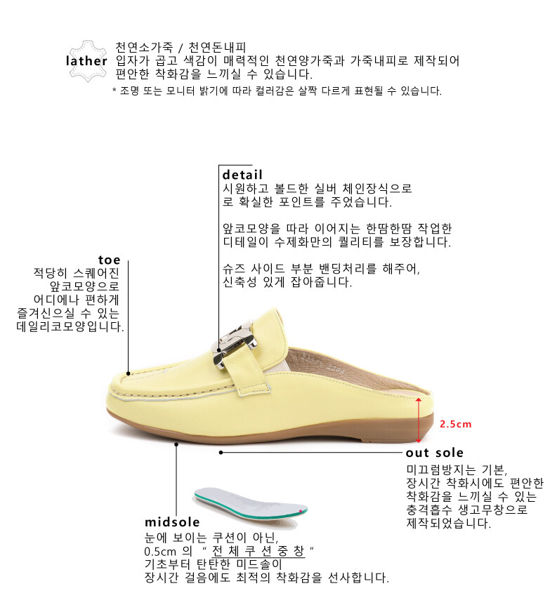 COMMENT 묵직하고 시원한 실버체인이 포인트로 들어간 산뜻한 블로퍼를 소개해드립니다. 입자가 곱고 색감이 매력적인 천연양가죽과 가죽내피로 제작되어 편안한 착화감을 느끼실 수 있습니다. 시원하고 볼드한 실버 체인장식으로 로 확실한 포인트를 주었습니다. 앞코모양을 따라 이어지는 한땀한땀 작업한 디테일이 수제화만의 퀄리티를 보장합니다. 슈즈 사이드 부분 밴딩처리를 해주어, 신축성 있게 잡아줍니다. 적당히 스퀘어진 앞코모양으로 어디에나 편하게 즐겨신으실 수 있는 데일리코모양입니다. 미끄럼방지는 기본, 장시간 착화시에도 편안한 착화감을 느끼실 수 있는 충격흡수 생고무창으로 제작되었습니다.