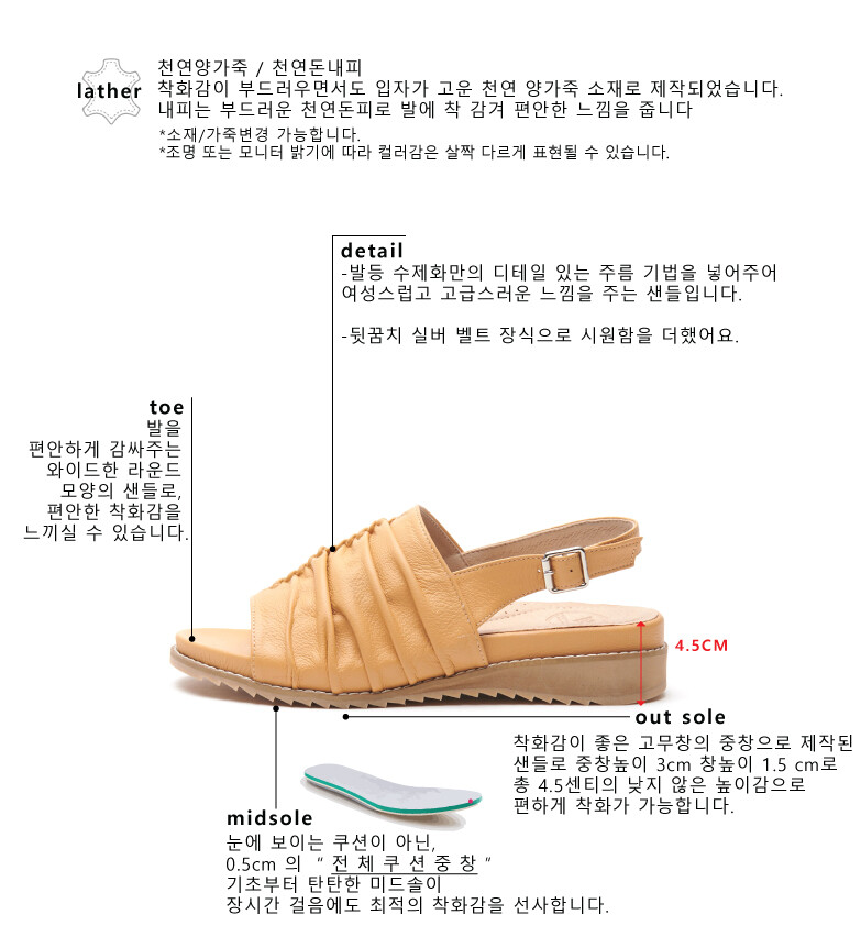 COMMENT 발등 주름 디테일로 여성스러운 포인트를 주었고, 부드러운 소재와 내피로 발을 편안히 감싸주는 샌들을 소개해드려요! 착화감이 부드러우면서도 입자가 고운 천연 양가죽 소재로 제작되었습니다. 내피는 부드러운 천연돈피로 발에 착 감겨 편안한 느낌을 줍니다. 발을 편안하게 감싸주는 넓직한 라운드 모양의 샌들로, 편안한 착화감을 느끼실 수 있습니다. 발등부분 수제화만의 디테일 있는 주름 기법을 넣어주어 여성스럽고 고급스러운 느낌을 주는 샌들입니다. 뒷꿈치 실버 벨트 장식으로 시원함을 더했어요. 착화감이 좋은 고무창의 중창으로 제작된 샌들로 중창높이 2.5cm 창높이 1cm로 총 3.5센티의 높이감으로 편하게 착화가 가능합니다. 말랑한 고무창의 인솔로 장시간 착화시에도 편하게 신을 수 있습니다. 빗살바닥창으로 여름철 미끄럼방지 효과를 줍니다.