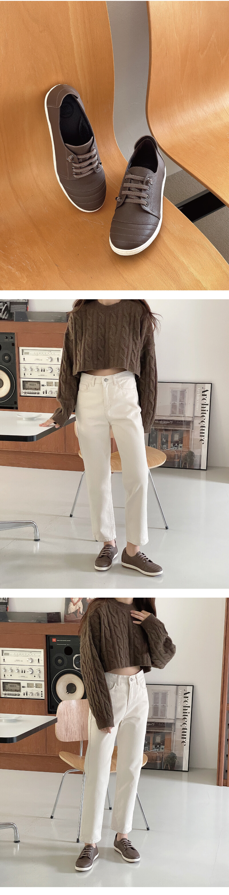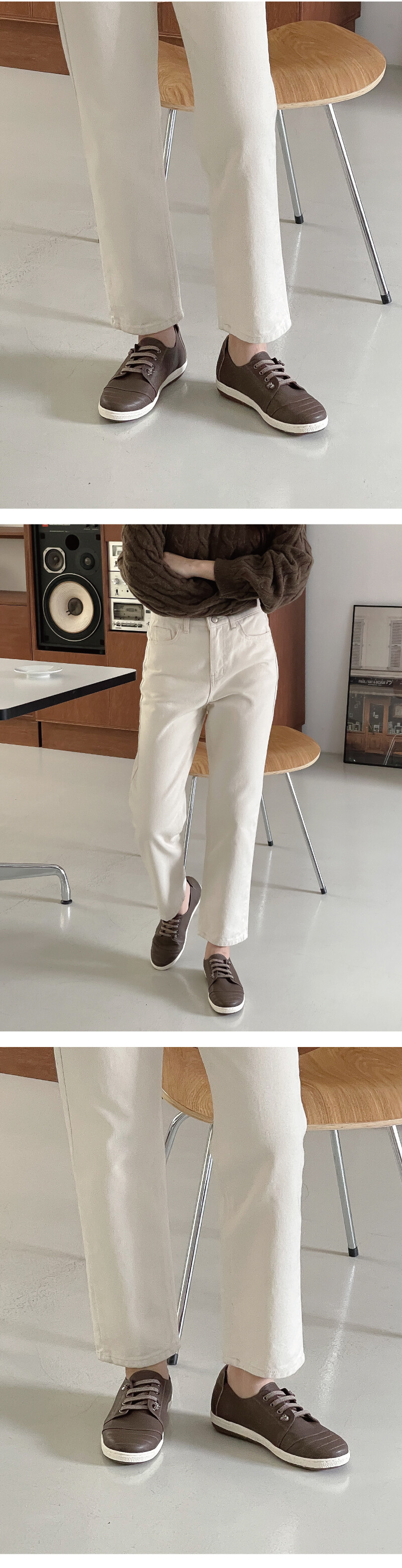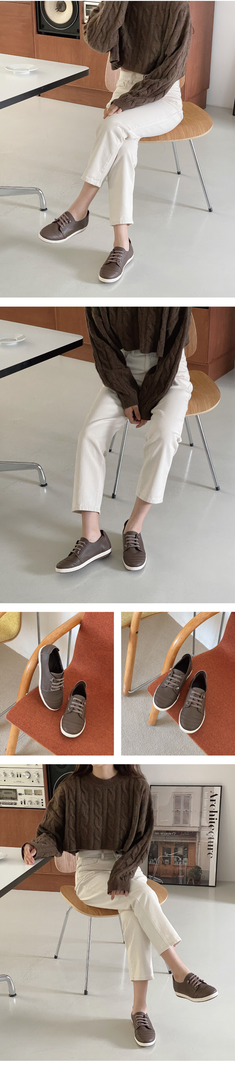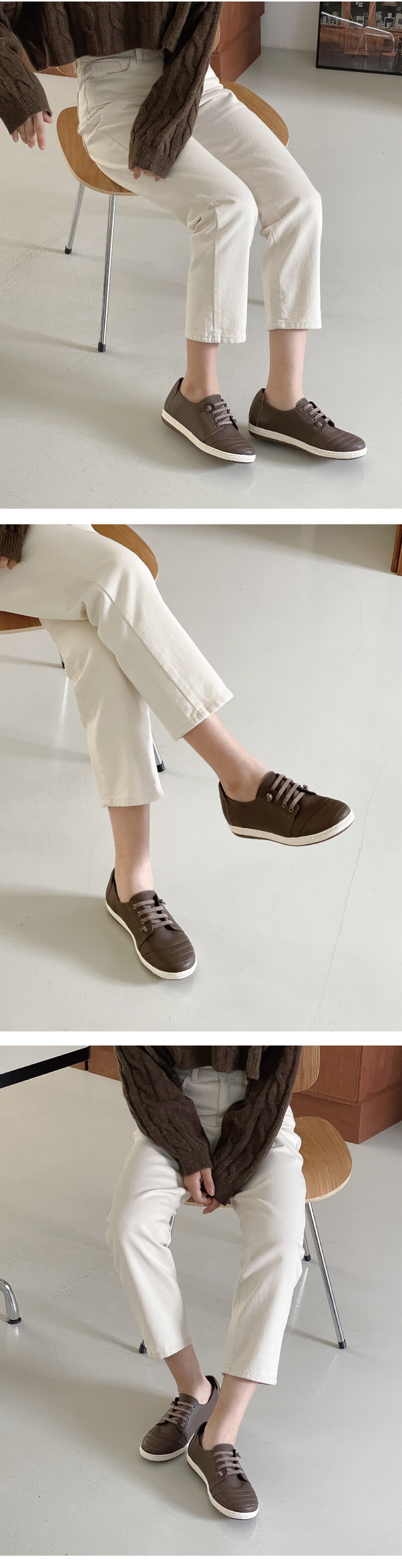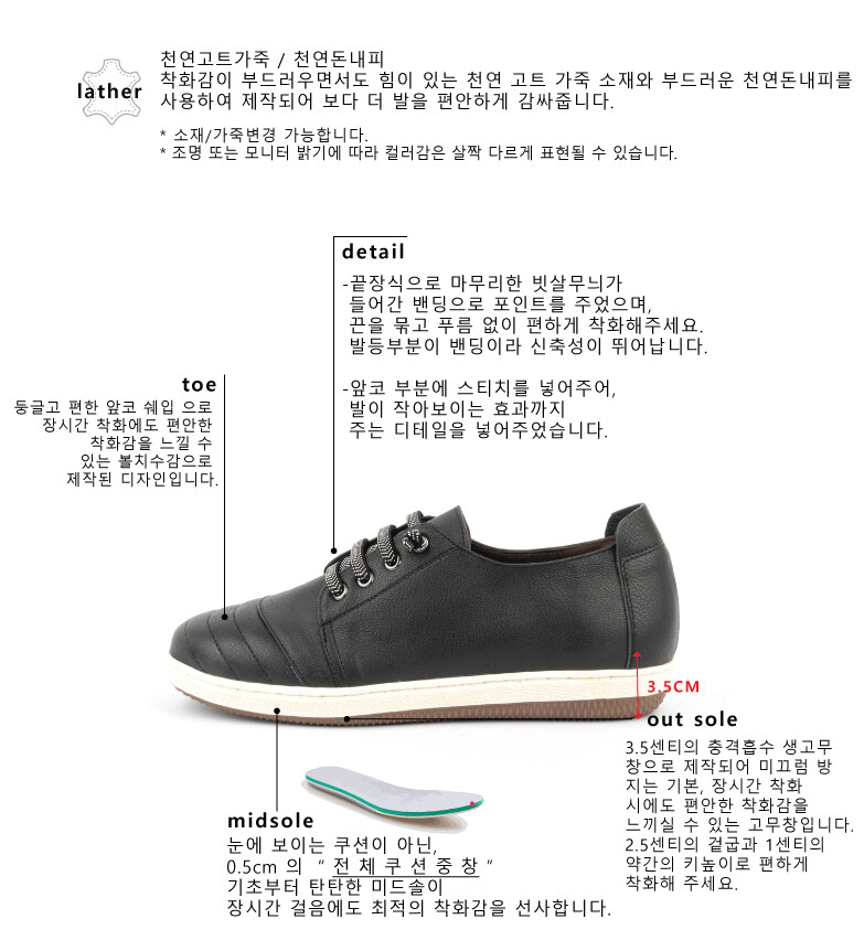 COMMENT 발등의 밴딩으로편안한 착화감을 느끼실 수 있는 스니커즈를 소개해드려요! 착화감이 부드러우면서도 힘이 있는 천연 고트 가죽 소재와 부드러운 천연돈내피를 사용하여 제작되어 보다 더 발을 편안하게 감싸줍니다. 둥글고 편한 앞코 쉐입 으로 장시간 착화에도 편안한 착화감을 느낄 수 있는 볼치수감으로 제작된 디자인입니다. 끝장식으로 마무리한 빗살무늬가 들어간 밴딩으로 포인트를 주었으며, 끈을 묶고 푸름 없이 편하게 착화해주세요. 발등부분이 밴딩이라 신축성이 뛰어납니다. 앞코 부분에 스티치를 넣어주어, 발이 작아보이는 효과까지 주는 디테일을 넣어주었습니다. 3.5센티의 충격흡수 생고무창으로 제작되어 미끄럼 방지는 기본, 장시간 착화 시에도 편안한 착화감을 느끼실 수 있는 고무창입니다. 2.5센티의 겉굽과 1센티의 약간의 키높이로 편하게 착화해 주세요.