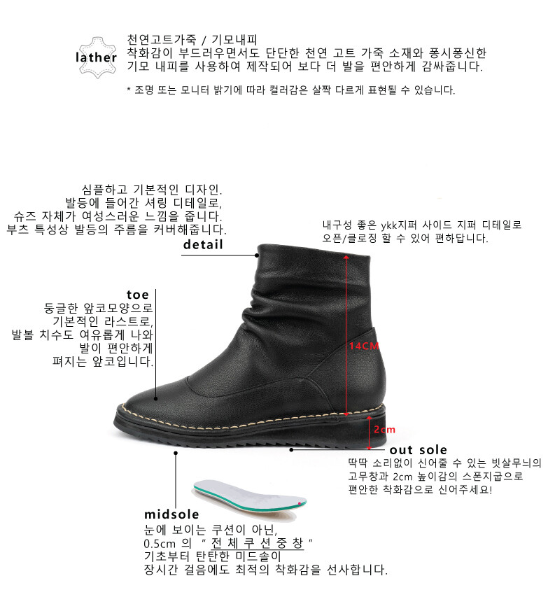 COMMENT 스티치가 포인트가 되는, 수제화 앵클 부츠를 소개합니다! 착화감이 부드러우면서도 단단한 천연 고트 가죽 소재와 퐁시퐁신한 기모 내피를 사용하여 제작되어 보다 더 발을 편안하게 감싸줍니다. 부츠 총기장(굽 제외) 14cm의 비교적 짧은 기장감으로 신고 벗기 편한 숏부츠입니다. (*235사이즈 기준이므로 약간의 오차는 있을 수 있으니 참고해 주세요) 둥글한 앞코모양으로 기본적인 라스트로, 발볼 치수도 여유롭게 나와 발이 편안하게 펴지는 앞코입니다. 심플하고 기본적인 디자인. 발등에 들어간 셔링 디테일로, 슈즈 자체가 여성스러운 느낌을 줍니다. 부츠 특성상 발등의 주름을 커버해줍니다. 코 모양을 따라 한땀 한땀 핸드메이드로 꼬매준 디테일의 앵클부츠로 수제화만 퀄리티를 느껴보세요! 내구성 좋은 ykk지퍼 사이드 지퍼 디테일로 오픈/클로징 할 수 있어 편하답니다. 딱딱 소리없이 신어줄 수 있는 빗살무늬의 고무창과 2cm 높이감의 스폰지굽으로 편안한 착화감으로 신어주세요!