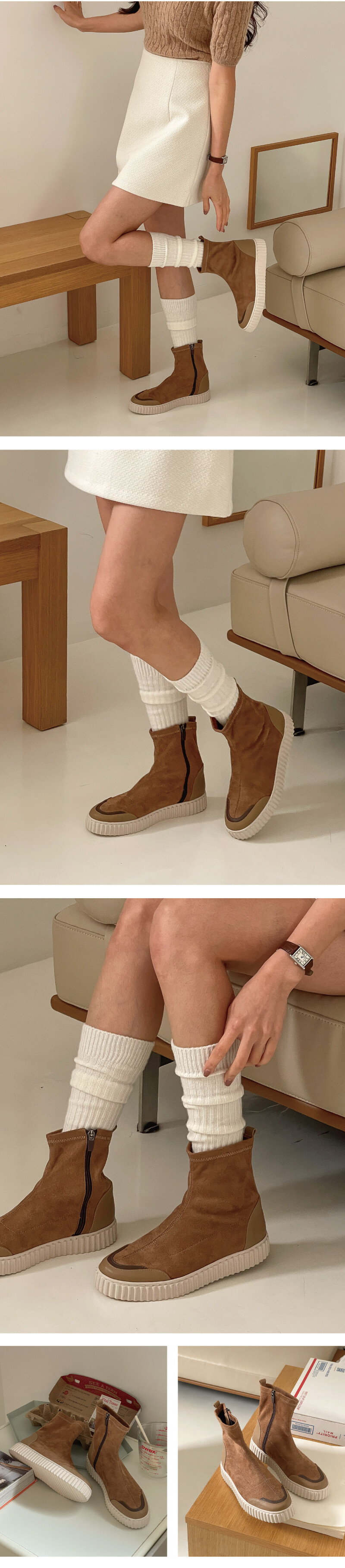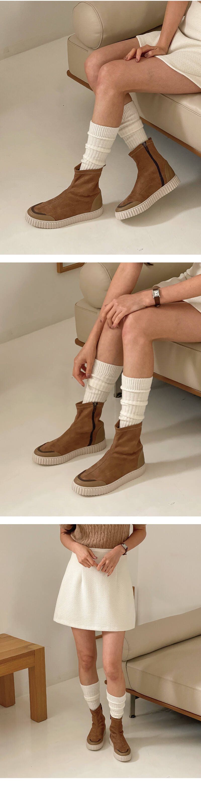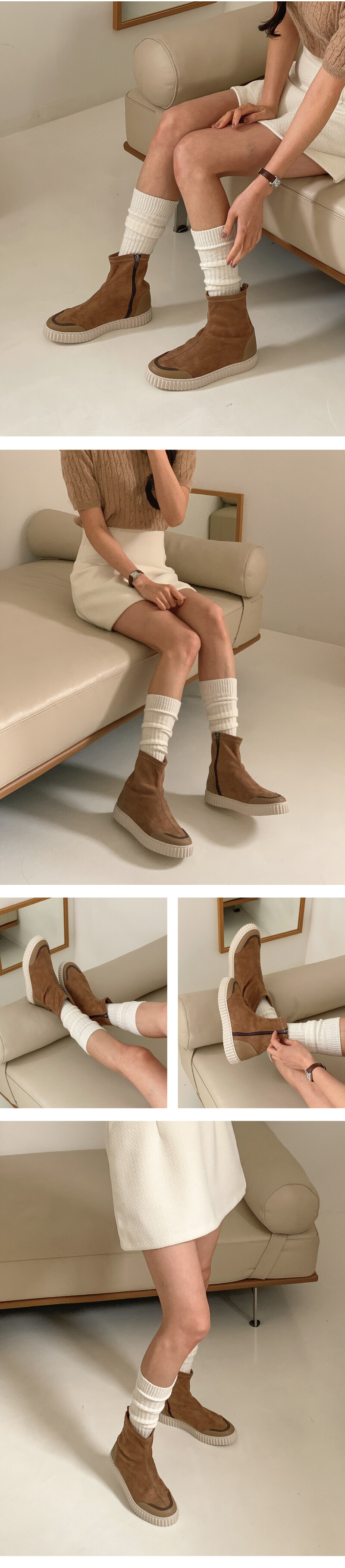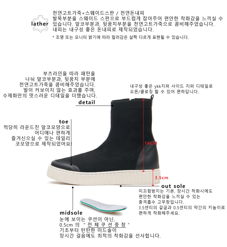COMMENT 따뜻하게 감싸주는 스판소재와, 가죽의 은은한 콤비로 멋스럽게 신을수 있는 앵클부츠를 소개해드려요! 발목부분을 스웨이드 스판으로 부드럽게 잡아주어 편안한 착화감을 느끼실 수 있습니다. 앞코부분과, 뒷꿈치부분을 천연고트가죽으로 콤비해주었습니다. 내피는 내구성 좋은 돈내피로 제작되었습니다. 부츠 총기장(굽 제외) 16cm의 적당한 기장감으로 제작된 앵클부츠입니다. (*235사이즈 기준이므로 약간의 오차는 있을 수 있으니 참고해 주세요) 적당히 라운드진 앞코모양으로 어디에나 편하게 즐겨신으실 수 있는 데일리 코모양으로 제작되었어요! 부츠라인을 따라 패턴을 나눠 앞코부분과, 뒷꿈치 부분에 천연고트가죽을 콤비해주었습니다. 발이 커보이지 않는 효과를 주며, 수제화만의 멋스러운 디테일을 더했습니다. 내구성 좋은 ykk지퍼 사이드 지퍼 디테일로 오픈/클로징 할 수 있어 편하답니다. 미끄럼방지는 기본, 장시간 착화시에도 편안한 착화감을 느끼실 수 있는 충격흡수 고무창입니다. 3.5센티의 겉굽과 0.5센티의 약간의 키높이로 편하게 착화해주세요.