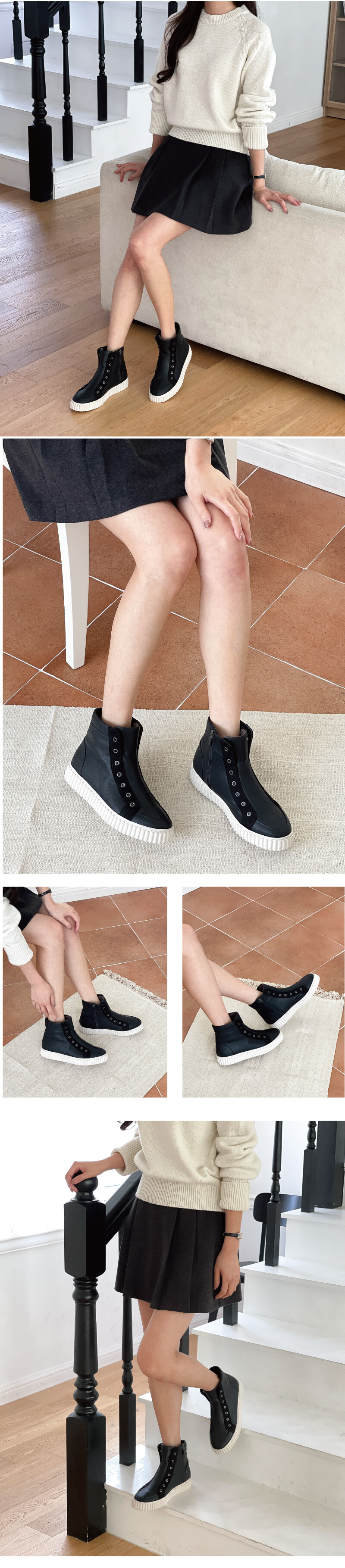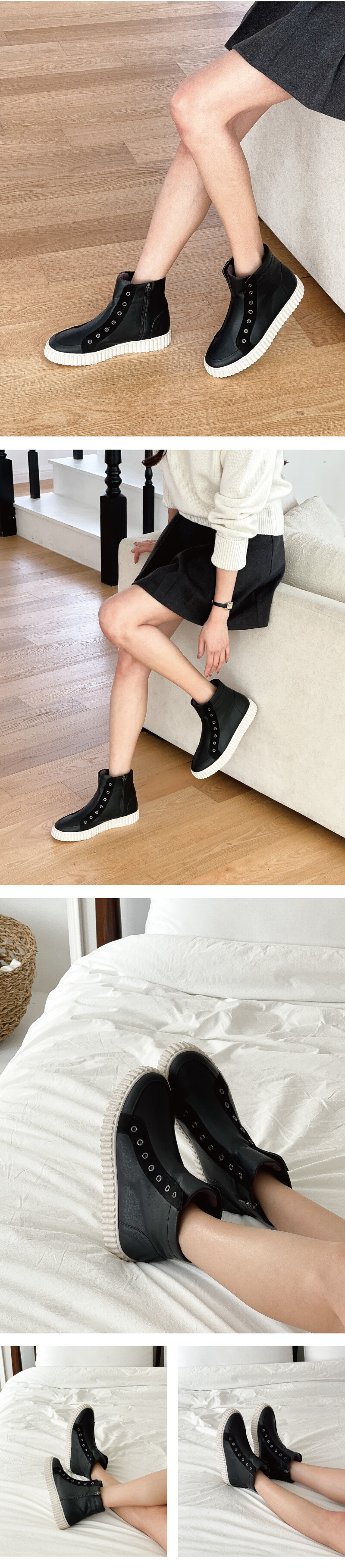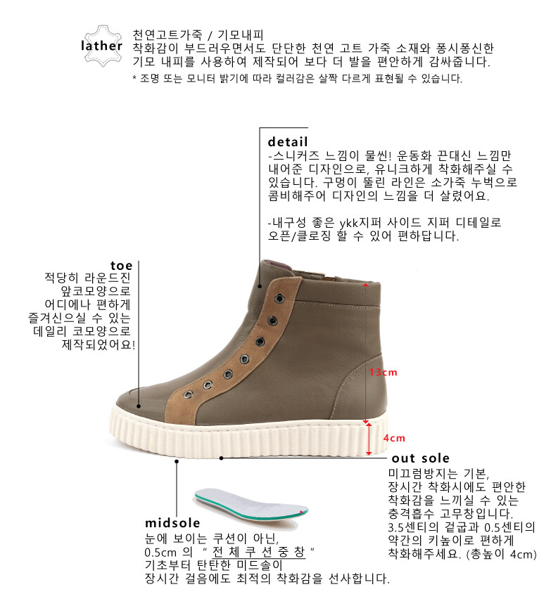 COMMENT 스니커즈 인듯~ 부츠인듯~ 발목까지 올라오는 착화감 편한 스니커즈부츠를 소개해드려요! 착화감이 부드러우면서도 단단한 천연 고트 가죽 소재와 퐁시퐁신한 기모 내피를 사용하여 제작되어 보다 더 발을 편안하게 감싸줍니다. 부츠 총기장(굽 제외) 13cm의 비교적 짧은 기장감으로 신고 벗기 편한 숏부츠입니다. (*235사이즈 기준이므로 약간의 오차는 있을 수 있으니 참고해 주세요) 적당히 라운드진 앞코모양으로 어디에나 편하게 즐겨신으실 수 있는 데일리 코모양으로 제작되었어요! 스니커즈 느낌이 물씬! 운동화 끈대신 느낌만 내어준 디자인으로, 유니크하게 착화해주실 수 있습니다. 구멍이 뚤린 라인은 소가죽 누벅으로 콤비해주어 디자인의 느낌을 더 살렸어요. 내구성 좋은 ykk지퍼 사이드 지퍼 디테일로 오픈/클로징 할 수 있어 편하답니다. 미끄럼방지는 기본, 장시간 착화시에도 편안한 착화감을 느끼실 수 있는 충격흡수 고무창입니다. 3.5센티의 겉굽과 0.5센티의 약간의 키높이로 편하게 착화해주세요. (총높이 4cm)