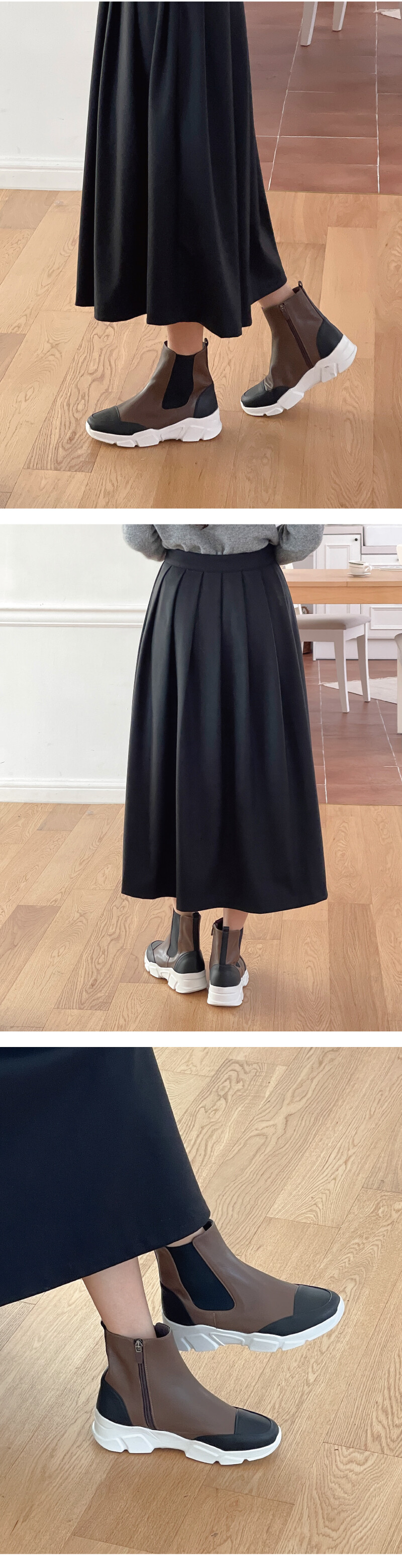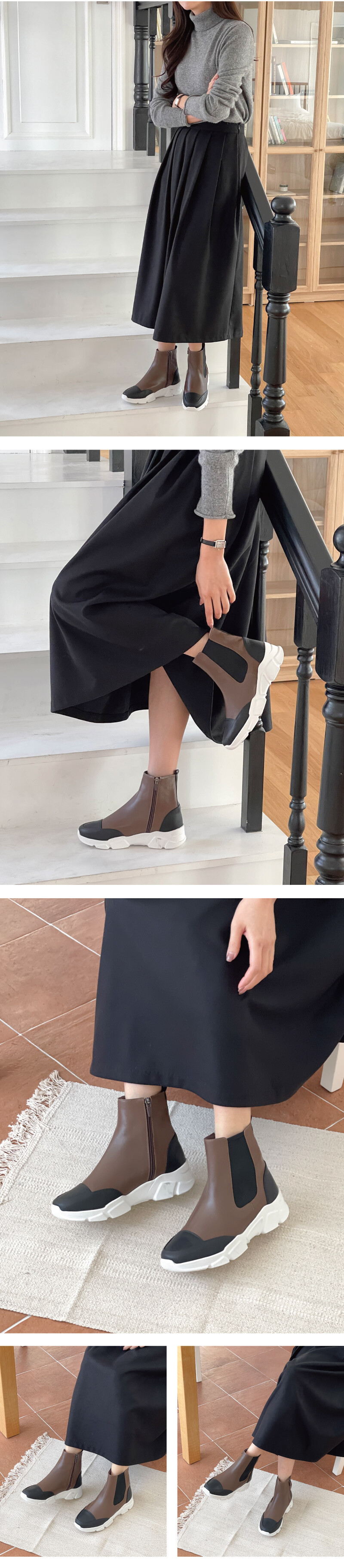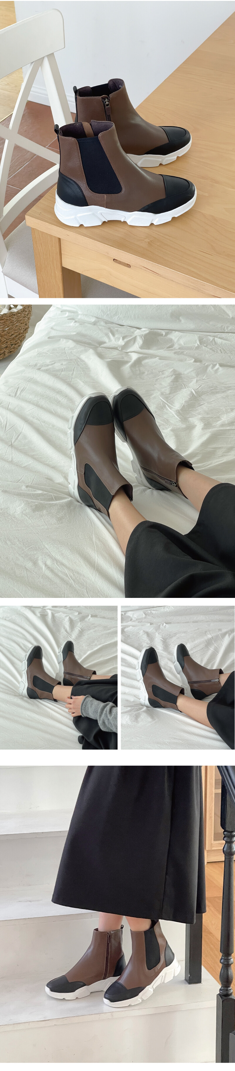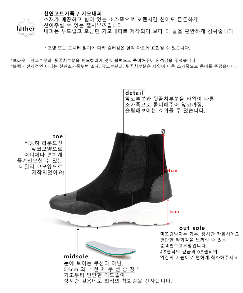 COMMENT 소재가 매끈하고 힘이 있는 소가죽으로 오랜시간 신어도 튼튼하게 신어주실 수 있는 첼시부츠입니다. 내피는 부드럽고 포근한 기모내피로 제작되어 보다 더 발을 편안하게 감싸줍니다. 부츠 총기장(굽 제외) 14cm의 적당한 기장감으로 제작된 앵클부츠입니다. (*235사이즈 기준이므로 약간의 오차는 있을 수 있으니 참고해 주세요) 적당히 라운드진 앞코모양으로 어디에나 편하게 즐겨신으실 수 있는 데일리 코모양으로 제작되었어요! 앞코부분과 뒷꿈치부분을 타입이 다른 소가죽으로 콤비해주어 앞코까짐, 슬림해보이는 효과를 주 었습니다. *브라운 - 앞코부분과, 뒷꿈치부분을 밴드컬러에 맞춰 블랙으로 콤비해주어 안정감을 주었습니다. *블랙 - 전체적인 바디는 천연소가죽누벅 소재, 앞코부분과, 뒷꿈치부분은 타입이 다른 소가죽으로 콤비를 주었습니다. 양쪽 사이즈 밴딩 처리 대신 안쪽부분은 내구성 좋은 ykk지퍼 사이드 지퍼 디테일로 오픈/클로징 할 수 있어 편하답니다. 미끄럼방지는 기본, 장시간 착화시에도 편안한 착화감을 느끼실 수 있는 충격흡수 고무창입니다. 4.5센티의 겉굽과 0.5센티의 약간의 키높이로 편하게 착화해주세요.