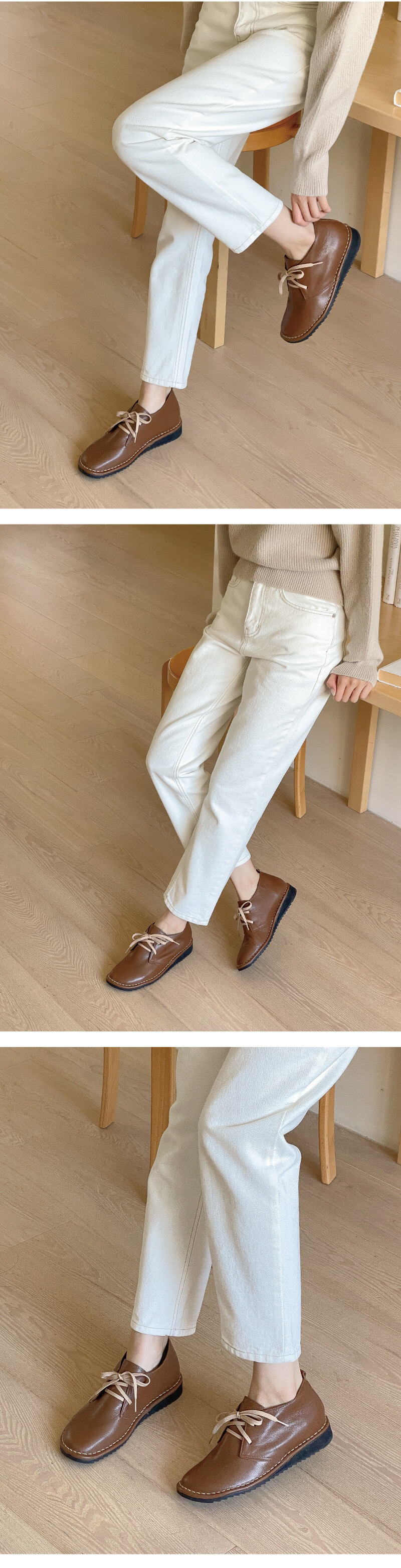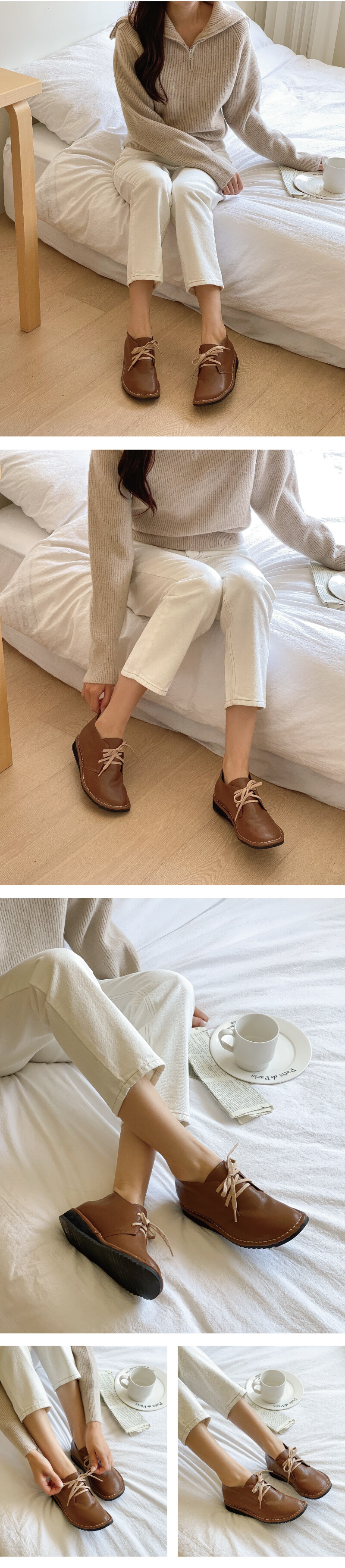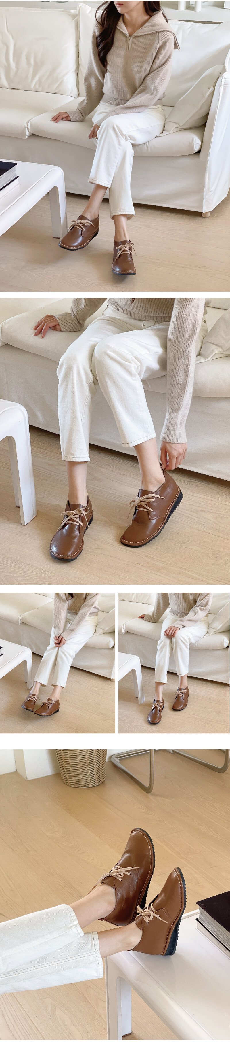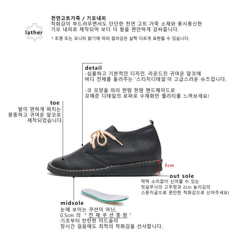 COMMENT 스티치가 포인트가 되는 로퍼를 소개해드려요! 착화감이 부드러우면서도 단단한 천연 고트 가죽 소재와 퐁시퐁신한 기모 내피를 사용하여 제작되어 보다 더 발을 편안하게 감싸줍니다. 발이 편하게 펴지는 뭉뚱하고 귀여운 앞코로 제작되었습니다. 심플하고 기본적인 디자인. 뭉뚱하고 귀여운 앞코에 바디 전체를 둘러주는 '스티치디테일'이 고급스러운 슈즈입니다. 코 모양을 따라 한땀 한땀 핸드메이드로 꼬매준 디테일의 로퍼로 수제화만 퀄리티를 느껴보세요! 딱딱 소리없이 신어줄 수 있는 빗살무늬의 고무창과 2cm 높이감의 스폰지굽으로 편안한 착화감으로 신어주세요!