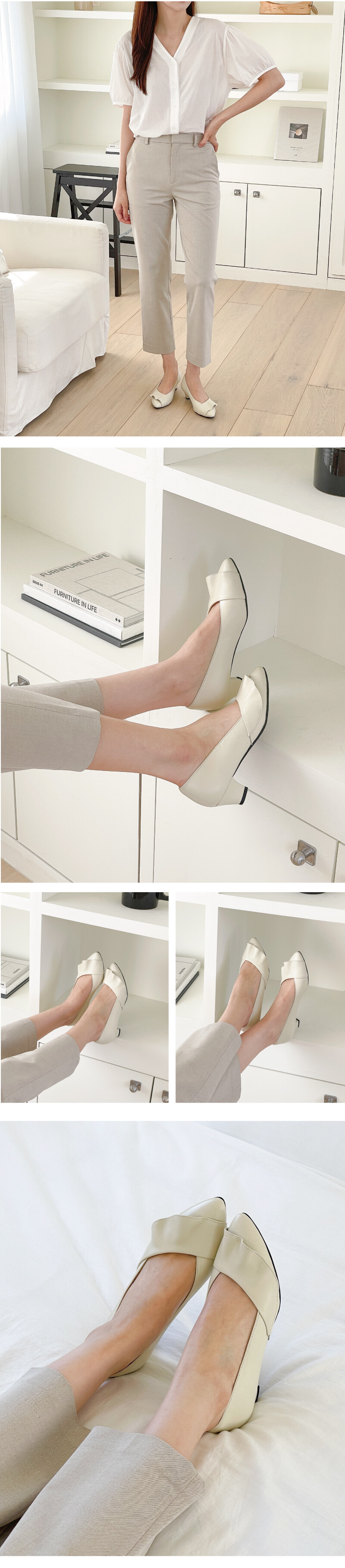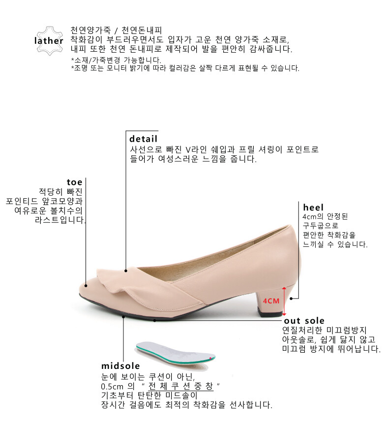 COMMENT 출퇴근 슈즈로 제격인 4센티의 적~당한 굽높이로 제작된 플랫슈즈를 소개해드려요! 전체적인 쉐잎은 사선 V라인으로 빠져 발이 슬림해 보이는 효과를 주며, 여성스러운 프릴이 포인트로 딱~ 올라갔어요. 착화감이 부드러우면서도 입자가 고운 천연 양가죽 소재로 제작되었습니다. 내피는 부드러운 천연돈피로 발에 착 감겨 편안한 느낌을 줍니다. 적당히 빠진 포인티드 앞코모양과 여유로운 볼치수의 라스트입니다. 사선으로 빠진 V라인 쉐입과 프릴 셔링이 포인트로 들어가 여성스러운 느낌을 줍니다. 4cm의 안정된 구두굽으로 편안한 착화감을 느끼실 수 있습니다. 일반창이 아닌, 생고무창을 써주어 장시간 착화시에도 고무창이 충격을 흡수해주어, 발에 피로감을 줄여줍니다.