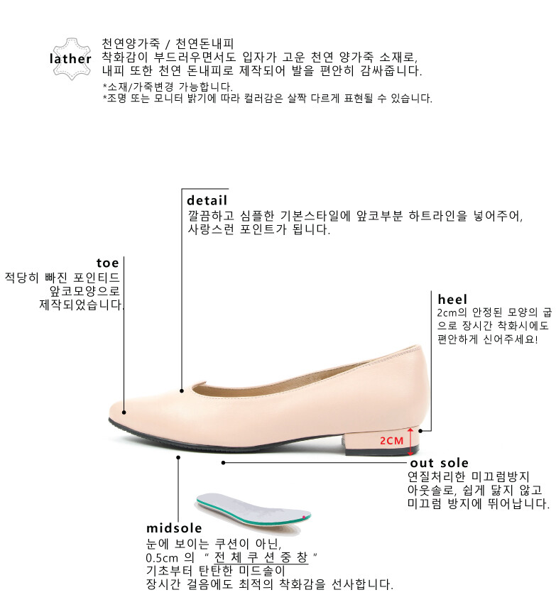 COMMENT 심플하면서도 사랑스러운 라인을 가진 플랫슈즈를 소개해드려요! 착화감이 부드러우면서도 입자가 고운 천연 양가죽 소재로 제작되었습니다. 내피는 부드러운 천연돈피로 발에 착 감겨 편안한 느낌을 줍니다.적당히 빠진 포인티드 앞코모양으로 제작되었습니다. 깔끔하고 심플한 기본스타일에 앞코부분 하트라인을 넣어주어, 사랑스런 포인트가 됩니다. 2cm의 안정된 모양의 굽으로 장시간 착화시에도 편안하게 신어주세요! 일반창을 연질처리한 아웃솔로, 쉽게 닳지 않고 미끄럼방지에 뛰어납니다.