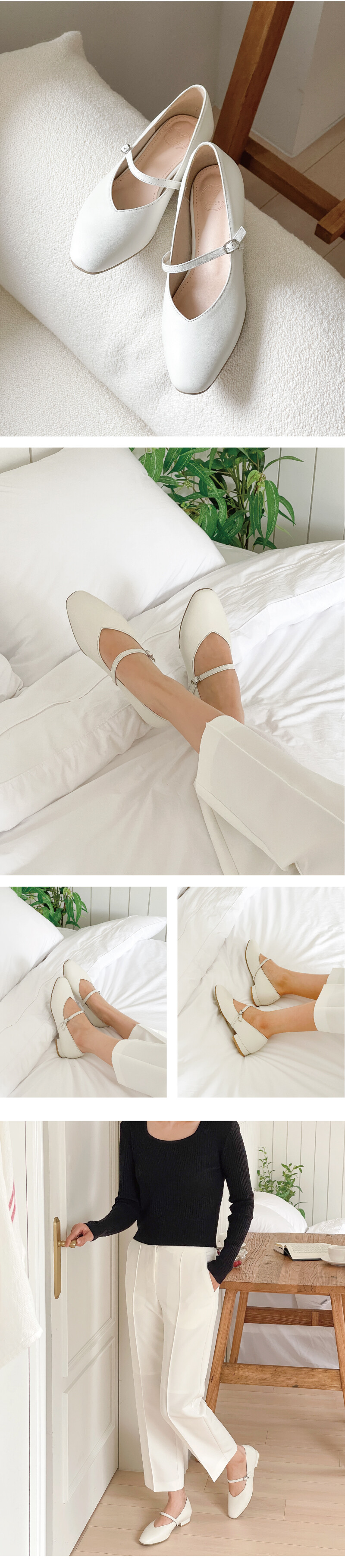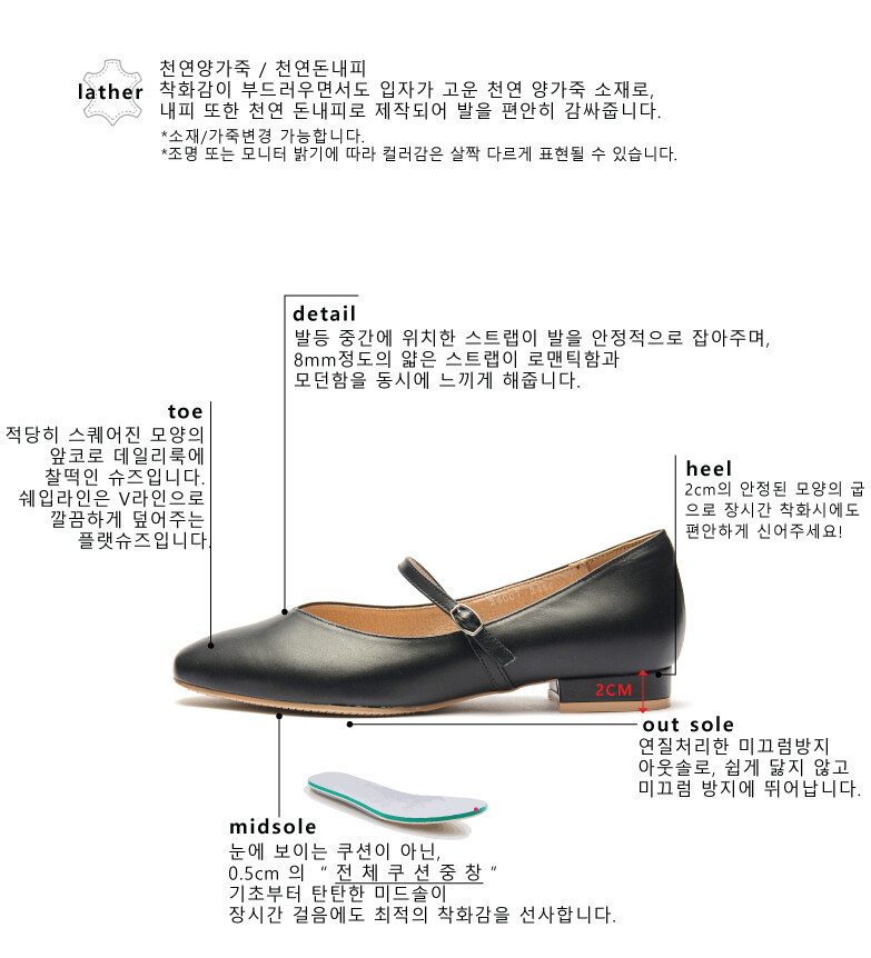 COMMENT 로맨틱함과 모던함을 동시에 느낄 수 있는 부드러운 플랫슈즈 입니다. 착화감이 부드러우면서도 입자가 고운 천연 양가죽 소재로, 내피 또한 천연 돈내피로 제작되어 발을 편안히 감싸줍니다. 적당히 스퀘어진 모양의 앞코로 데일리룩에 찰떡인 슈즈입니다. 쉐입라인은 V라인으로 깔끔하게 덮어주는 플랫슈즈입니다. 발등 중간에 위치한 스트랩이 발을 안정적으로 잡아주며, 8mm정도의 얇은 스트랩이 로맨틱함과 모던함을 동시에 느끼게 해줍니다. 2cm의 넓은 사각굽모양으로 편안하고 안정적인 착화감을 느끼실 수 있습니다. 일반창을 연질처리한 아웃솔로, 쉽게 닳지 않고 미끄럼방지에 뛰어납니다.