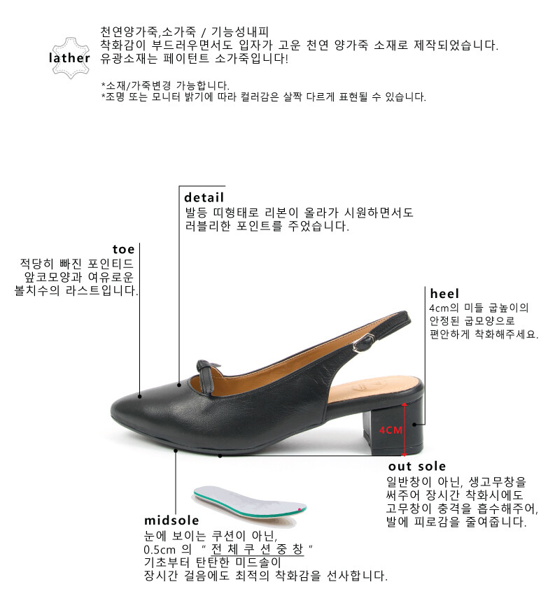 COMMENT 발등에 러블리한 리본이 포인트로 들어간 슬링백스타일의 슈즈를 소개해드려요! 여성스러운 느낌을 팍팍 어필하실 수 있는, 미들굽 4cm 높이로, 앞뒤로 뚤린 패턴으로 봄부터 여름까지 시원하게 착용가능합니다. 착화감이 부드러우면서도 입자가 고운 천연 양가죽 소재로 제작되었습니다. 유광소재는 페이턴트 소가죽입니다!적당히 빠진 포인티드 앞코모양과 여유로운 볼치수의 라스트입니다. 발등 띠형태로 리본이 올라가 시원하면서도 러블리한 포인트를 주었습니다. 4cm의 미들 굽높이의 안정된 굽모양으로 편안하게 착화해주세요.일반창이 아닌, 생고무창을 써주어 장시간 착화시에도 고무창이 충격을 흡수해주어, 발에 피로감을 줄여줍니다.