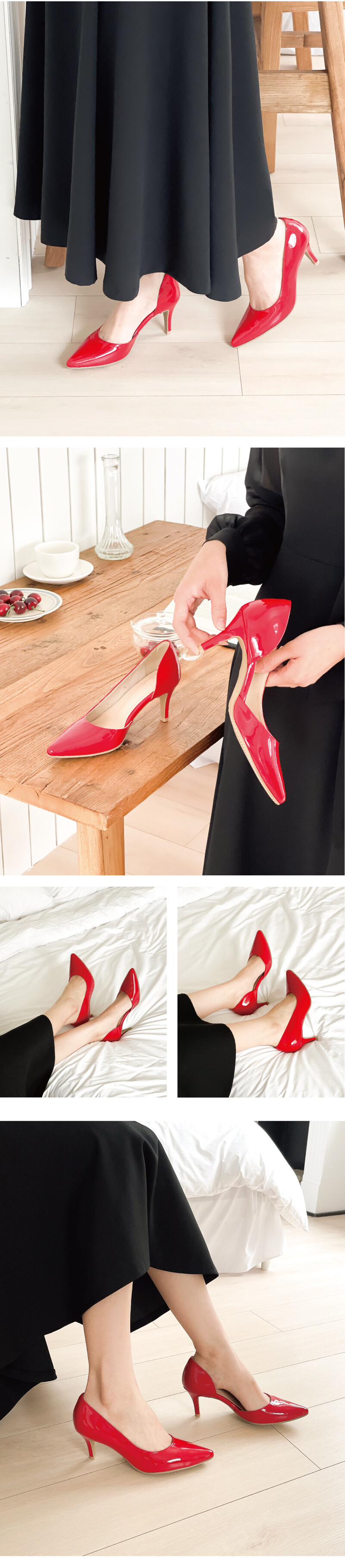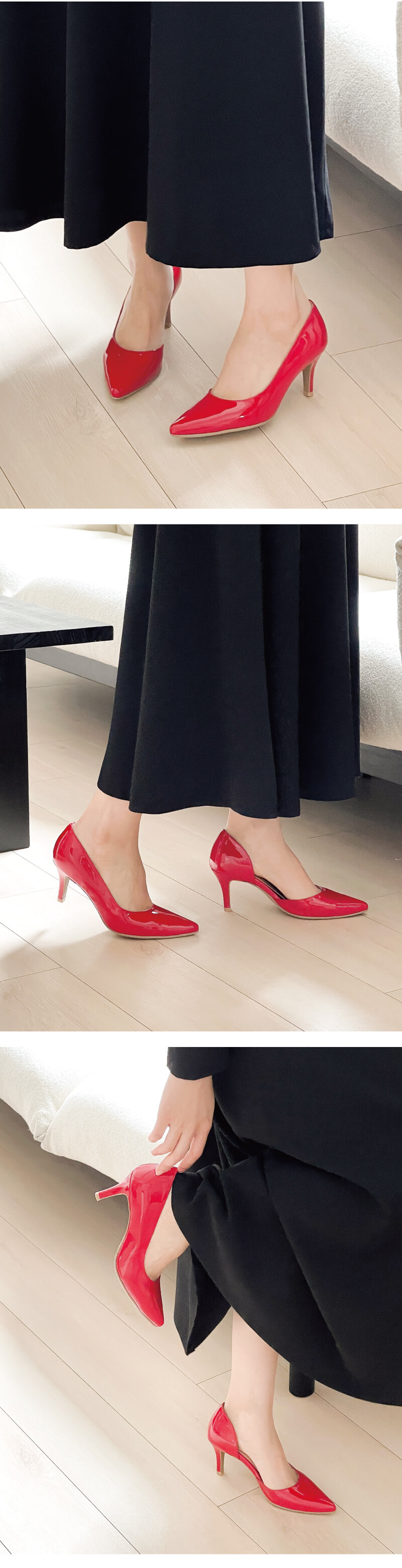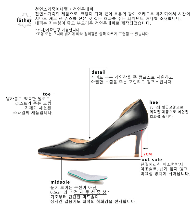 COMMENT 사이드 오픈으로 시원하면서도 세련되게 착화해줄 펌프스힐을 소개합니다!천연소가죽의 제품으로, 코팅이 되어 있어 특유의 광이 오래도록 유지되어서 시간이 지나도 새로 산 슈즈를 신은 것 같은 효과를 주는 페이턴트 애나멜 소재랍니다. 내피는 지속성이 좋고 부드러운 천연돈내피로 제작되었습니다.날카롭고 뾰족한 앞코로, 라스트가 주는 느낌 자체가 세련된 스타일의 제품입니다.사이드 부분 라인감을 준 펌프스로 시원하고 아찔한 느낌을 주는 포인티드 펌프스입니다.7cm의 힐굽모양으로 제작된 제품으로 세련되고 늘씬해보이는 효과를 줍니다.일반창을 연질처리한 아웃솔로, 쉽게 닳지 않고 미끄럼방지에 뛰어납니다.