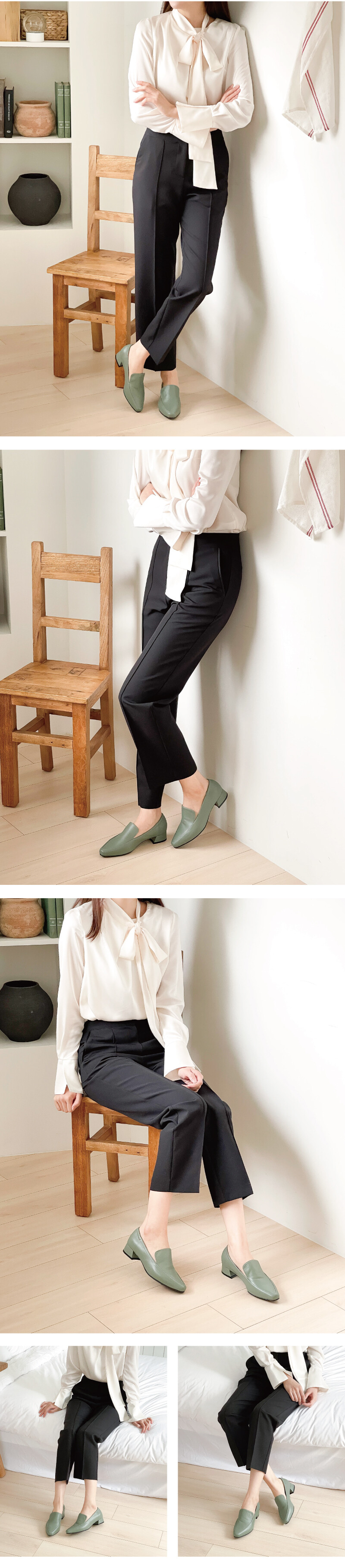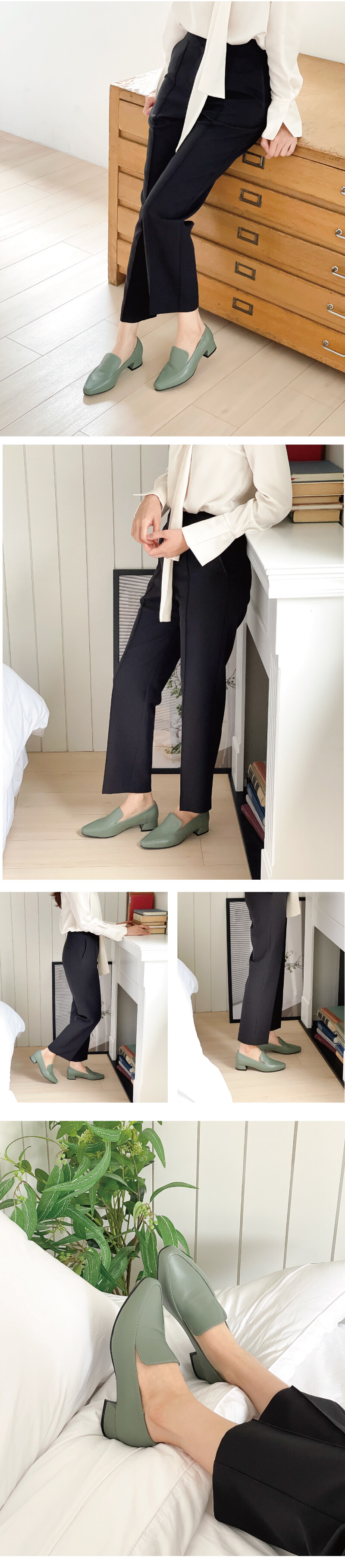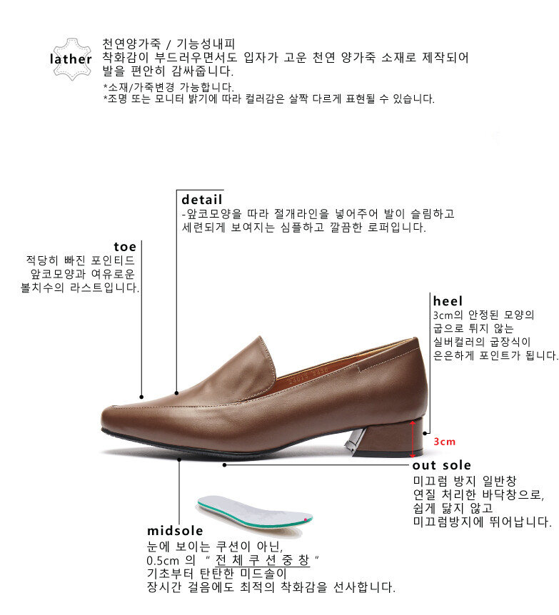 COMMENT 세련된 앞코와, 부드럽게 잡아주는 양가죽소재로 편하게 즐겨주세요 : ) 착화감이 부드러우면서도 입자가 고운 천연 양가죽 소재로 제작외어 발을 편안히 감싸줍니다. 적당히 빠진 포인티드 앞코모양과 여유로운 볼치수의 라스트입니다. 앞코모양을 따라 절개라인을 넣어주어 발이 슬림하고 세련되게 보여지는 심플하고 깔끔한 로퍼입니다.3cm의 안정된 모양의 굽으로 튀지 않는 실버컬러의 굽장식이 은은하게 포인트가 됩니다.일반창이 아닌, 생고무창을 써주어 장시간 착화시에도 고무창이 충격을 흡수해주어, 발에 피로감을 줄여줍니다.