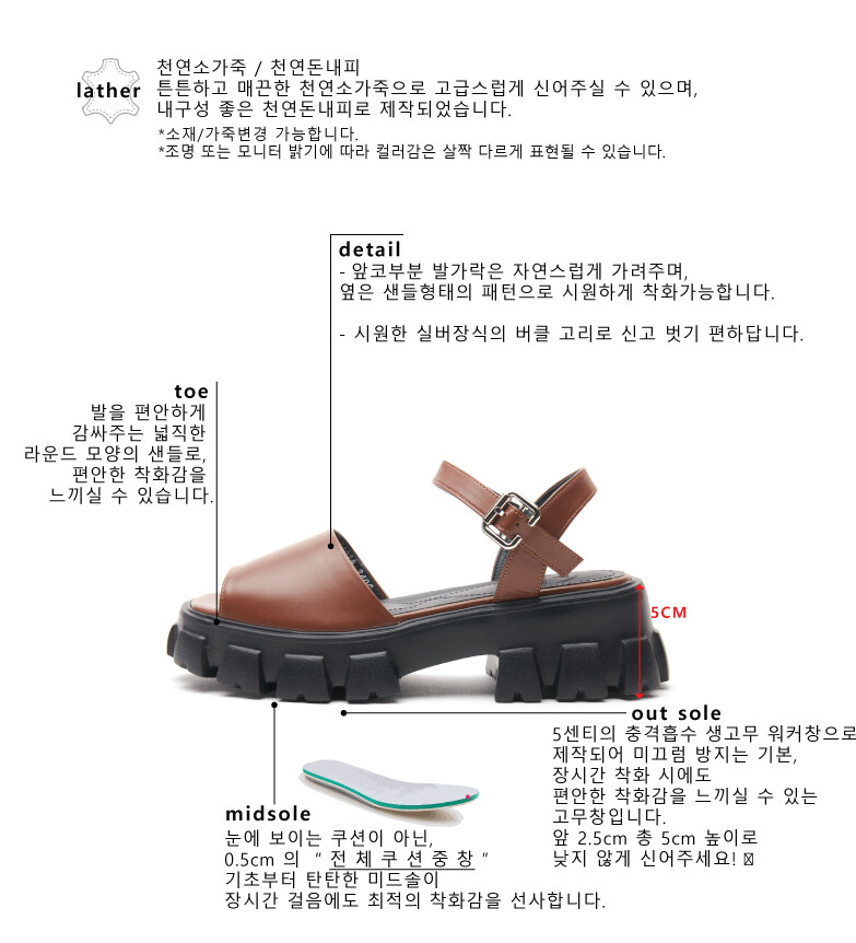 COMMENT 튼튼한 천연소가죽과 볼드한 아웃솔로 유니크하게 신어줄 샌들을 소개합니다! 튼튼하고 매끈한 천연소가죽으로 고급스럽게 신어주실 수 있으며, 내구성 좋은 천연돈내피로 제작되었습니다. 발을 편안하게 감싸주는 넓직한 라운드 모양의 샌들로, 편안한 착화감을 느끼실 수 있습니다. 앞코부분 발가락은 자연스럽게 가려주며, 옆은 샌들형태의 패턴으로 시원하게 착화가능합니다. 시원한 실버장식의 버클 고리로 신고 벗기 편하답니다. 5센티의 충격흡수 생고무 워커창 으로 제작되어 미끄럼 방지는 기본, 장시간 착화 시에도 편안한 착화감을 느끼실 수 있는 고무창입니다. 앞 2.5cm 총 5cm 높이로 낮지 않게 신어주세요!