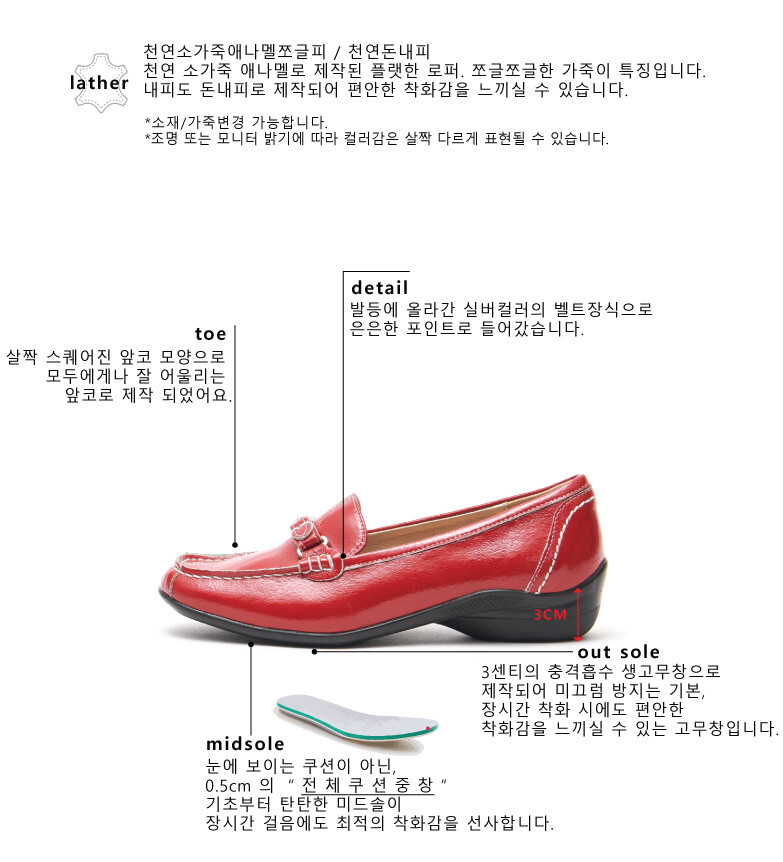 COMMENT 발등 벨드장식 디테일이 돋보이는 로퍼를 소개합니다 :) 천연 소가죽 애나멜로 제작된 플랫한 로퍼. 쪼글쪼글한 가죽이 특징입니다. 내피도 돈내피로 제작되어 편안한 착화감을 느끼실 수 있습니다. 살짝 스퀘어진 앞코 모양으로 모두에게나 잘 어울리는 앞코로 제작 되었어요. 발등에 올라간 실버컬러의 벨트장식으로 은은한 포인트로 들어갔습니다. 3센티의 충격흡수 생고무창으로 제작되어 미끄럼 방지는 기본, 장시간 착화 시에도 편안한 착화감을 느끼실 수 있는 고무창입니다.