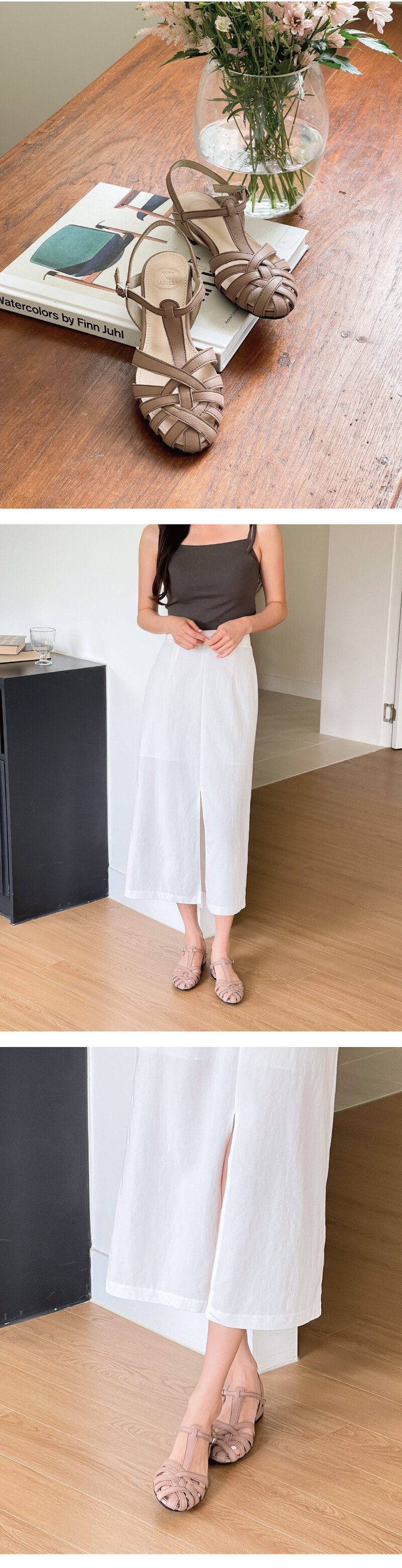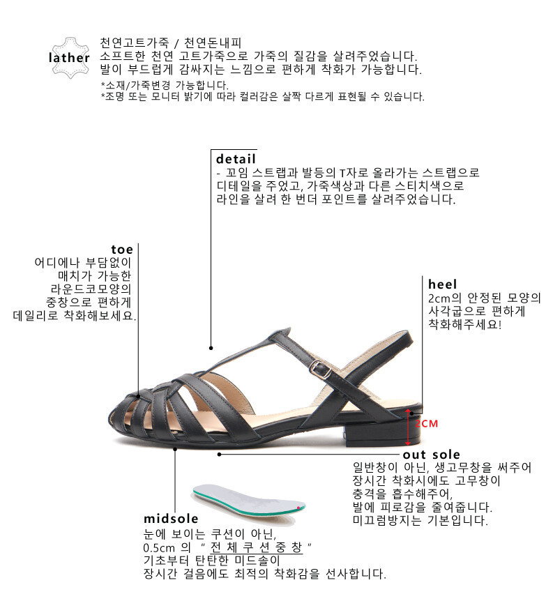 COMMENT 스트랩이 켜켜이 감싸주어, 발은 안보이게 가려주고~시원하게 신으실 수 있는 샌들입니다! 소프트한 천연 고트가죽으로 가죽의 질감을 살려주었습니다. 발이 부드럽게 감싸지는 느낌으로 편하게 착화가 가능합니다. 어디에나 부담없이 매치가 가능한 라운드코모양의 중창으로 편하게 데일리로 착화해보세요. 꼬임 스트랩과 발등의 T자로 올라가는 스트랩으로 디테일을 주었고, 가죽색상과 다른 스티치색으로 라인을 살려 한 번더 포인트를 살려주었습니다. 2cm의 안정된 모양의 사각굽으로 편하게 착화해주세요!