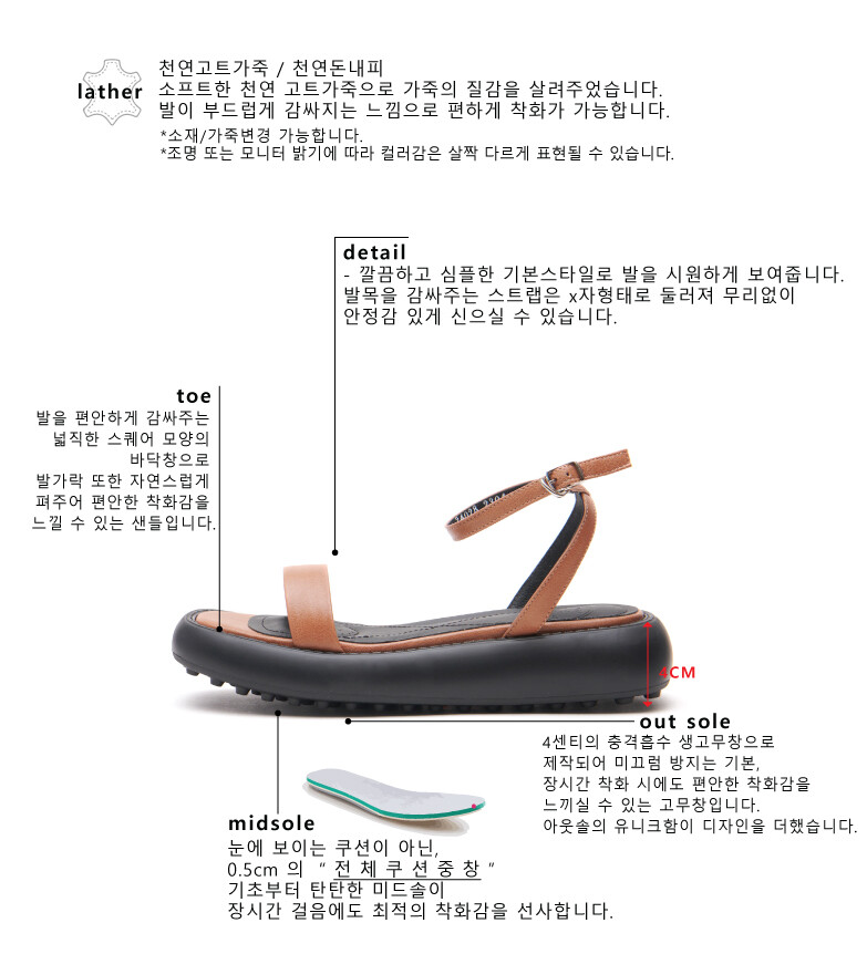 COMMENT 기본 패턴의 심플한 디자인에 유니크한 아웃솔로 제작된 샌들을 소개합니다! 매끈하고 힘있는 천연소가죽으로 제작된 샌들로, 내피까지 내구성좋은 돈내피로 들어갔습니다. 넓게 빠진 스퀘어 코모양으로 부담스럽지 않게 어디든 가볍게 신기 좋아요! 발을 편안하게 감싸주는 넓직한 스퀘어 모양의 바닥창으로 발가락 또한 자연스럽게 펴주어 편안한 착화감을 느낄 수 있는 샌들입니다. 깔끔하고 심플한 기본스타일로 발을 시원하게 보여줍니다. 4센티의 충격흡수 생고무창 으로 제작되어 미끄럼 방지는 기본, 장시간 착화 시에도 편안한 착화감을 느끼실 수 있는 고무창입니다. 아웃솔의 유니크함이 디자인을 더했습니다.