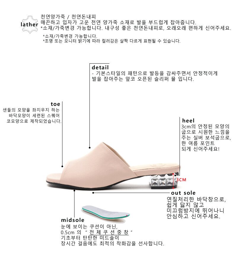 COMMENT 심플한 슬리퍼 뮬 디자인에 크리스탈보석 굽이 포인트로 들어간슈즈를 소개해드려요 : ) 매끈하고 입자가 고운 천연 양가죽 소재로 발을 부드럽게 잡아줍니다. *소재/가죽변경 가능합니다. 내구성 좋은 천연돈내피로, 오래오래 편하게 신어주세요. 샌들의 모양을 좌지우지 하는 바닥모양이 세련된 스퀘어 코모양으로, 어디에나 즐겨신으실 수 있습니다. 기본스타일의 패턴으로 발등을 감싸주면서 안정적이게 발을 잡아주는 앞코 오픈된 슬리퍼 뮬 입니다. 3cm의 안정된 모양의 굽으로 시원한 느낌을 주는 실버 보석굽으로, 한 여름 포인트 되게 신어주세요! 연질처리한 바닥창으로, 쉽게 닳지 않고 미끄럼방지에 뛰어나니 안심하고 신어주세요.