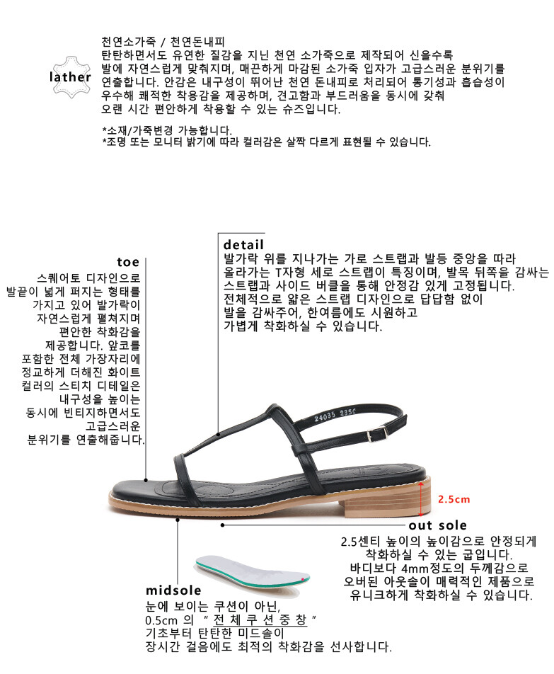 COMMENT T자형 얇은 세로 스트랩으로, 한 여름 시원하게 신을 수 있는 스퀘어토 모양의 샌들을 소개합니다! 탄하면서도 유연한 질감을 지닌 천연 소가죽으로 제작되어 신을수록 발에 자연스럽게 맞춰지며, 매끈하게 마감된 소가죽 입자가 고급스러운 분위기를 연출합니다. 안감은 내구성이 뛰어난 천연 돈내피로 처리되어 통기성과 흡습성이 우수해 쾌적한 착용감을 제공하며, 견고함과 부드러움을 동시에 갖춰 오랜 시간 편안하게 착용할 수 있는 슈즈입니다. **부드러운 가죽을 원하시는 경우, 소재 변경도 가능하니 문의 주세요. 스퀘어토 디자인으로 발끝이 넓게 퍼지는 형태를 가지고 있어 발가락이 자연스럽게 펼쳐지며 편안한 착화감을 제공합니다. 앞코를 포함한 전체 가장자리에 정교하게 더해진 화이트 컬러의 스티치 디테일은 내구성을 높이는 동시에 빈티지하면서도 고급스러운 분위기를 연출해줍니다. 발가락 위를 지나가는 가로 스트랩과 발등 중앙을 따라 올라가는 T자형 세로 스트랩이 특징이며, 발목 뒤쪽을 감싸는 스트랩과 사이드 버클을 통해 안정감 있게 고정됩니다. 전체적으로 얇은 스트랩 디자인으로 답답함 없이 발을 감싸주어, 한여름에도 시원하고 가볍게 착화하실 수 있습니다. 2.5센티 높이의 높이감으로 안정되게 착화하실 수 있는 굽입니다. 바디보다 4mm정도의 두께감으로 오버된 아웃솔이 매력적인 제품으로 유니크하게 착화하실 수 있습니다.