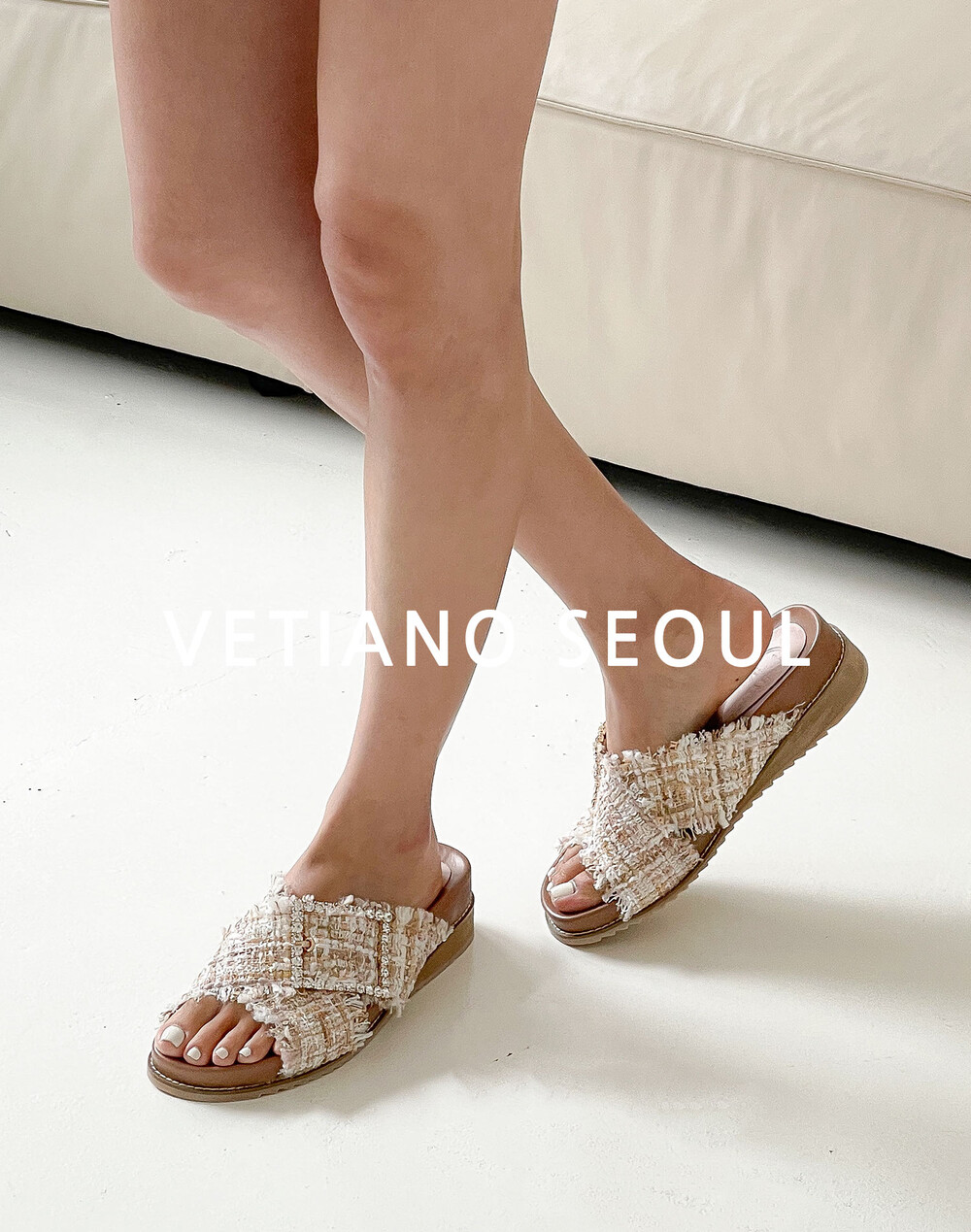 [VETIANO 베티아노] 트위드 X자 크리스탈 샌들 슬리퍼 2color / Tweed X-shaped crystal sandal slippers 2colors