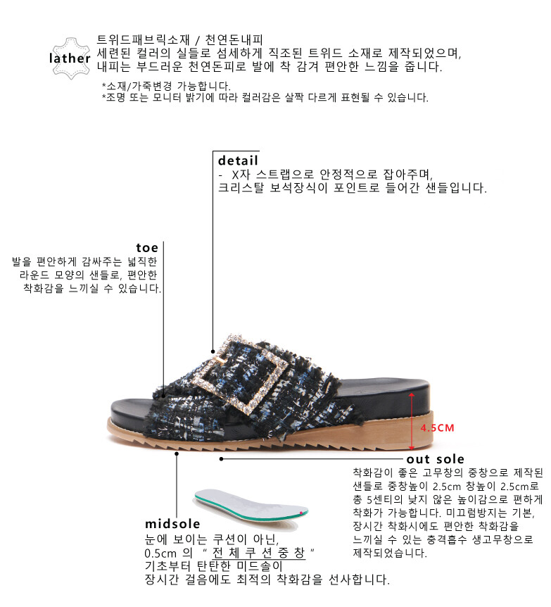 COMMENT 트위드 소재가 멋스러운, X자 스트랩의 블링한 장식까지 시원한 슬리퍼를 소개해드려요! 세련된 컬러의 실들로 섬세하게 직조된 트위드 소재로 제작되었으며, 내피는 부드러운 천연돈피로 발에 착 감겨 편안한 느낌을 줍니다. 발을 편안하게 감싸주는 넓직한 라운드 모양의 샌들로, 편안한 착화감을 느끼실 수 있습니다. X자 스트랩으로 안정적으로 잡아주며, 크리스탈 보석장식이 포인트로 들어간 샌들입니다. 착화감이 좋은 고무창의 중창으로 제작된 샌들로 중창높이 2.5cm 창높이 2.5cm로 총 5센티의 낮지 않은 높이감으로 편하게 착화가 가능합니다. 미끄럼방지는 기본, 장시간 착화시에도 편안한 착화감을 느끼실 수 있는 충격흡수 생고무창으로 제작되었습니다.