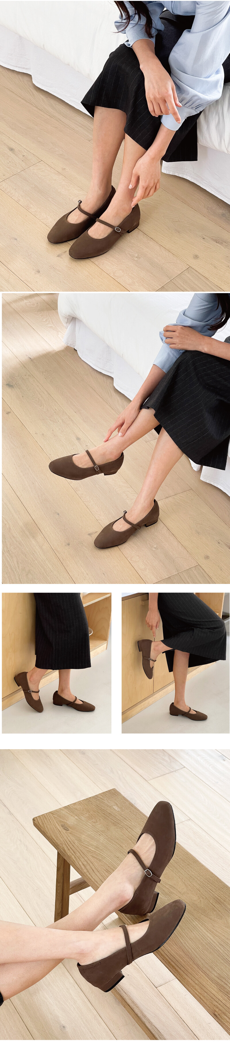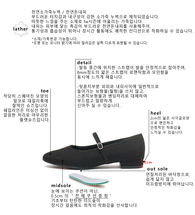 COMMENT 부드러운 터치감과 내구성이 강한 소가죽 누벅으로 제작되었습니다. 따뜻한 느낌을 주는 소재로 fw시즌에 어울리는 가죽입니다. 내피는 피부에 닿는 촉감이 부드러운 천연돈내피를 사용해주어, 통기성과 흡습성이 뛰어나 장시간 활동에도 쾌적한 컨디션으로 착화하실 수 있습니다. 적당히 스퀘어진 모양의 앞코로 데일리룩에 찰떡인 슈즈입니다. 쉐입라인은 미싱선 없이 깔끔한 처리로 마무리한 플랫슈즈입니다. 발등 중간에 위치한 스트랩이 발을 안정적으로 잡아주며, 8mm정도의 얇은 스트랩이 로맨틱함과 모던함을 동시에 느끼게 해줍니다. 뒷꿈치부분 외피와 내피사이에 일반적으로 들어가는 보형물(월형)을 쓰지 않고, 스폰지보형물과 밴딩처리로 대체하여 부드럽고 말랑하게 신어주 실 수 있습니다. 2cm의 넓은 사각굽모양으로 편안하고 안정적인 착화감을 느끼실 수 있습니다. 일반창이 아닌, 생고무창을 써주어 장시간 착화시에도 고무창이 충격을 흡수해주어, 발에 피로감을 줄여줍니다.