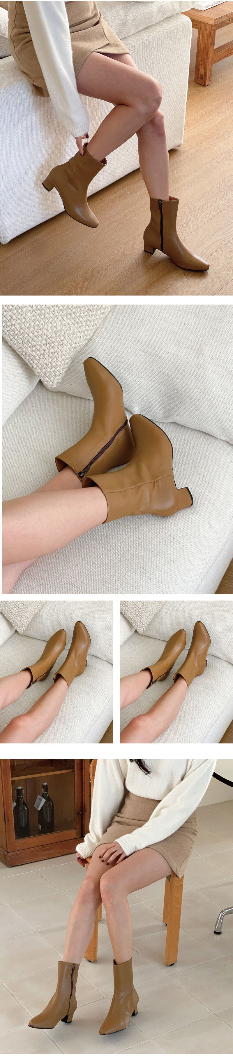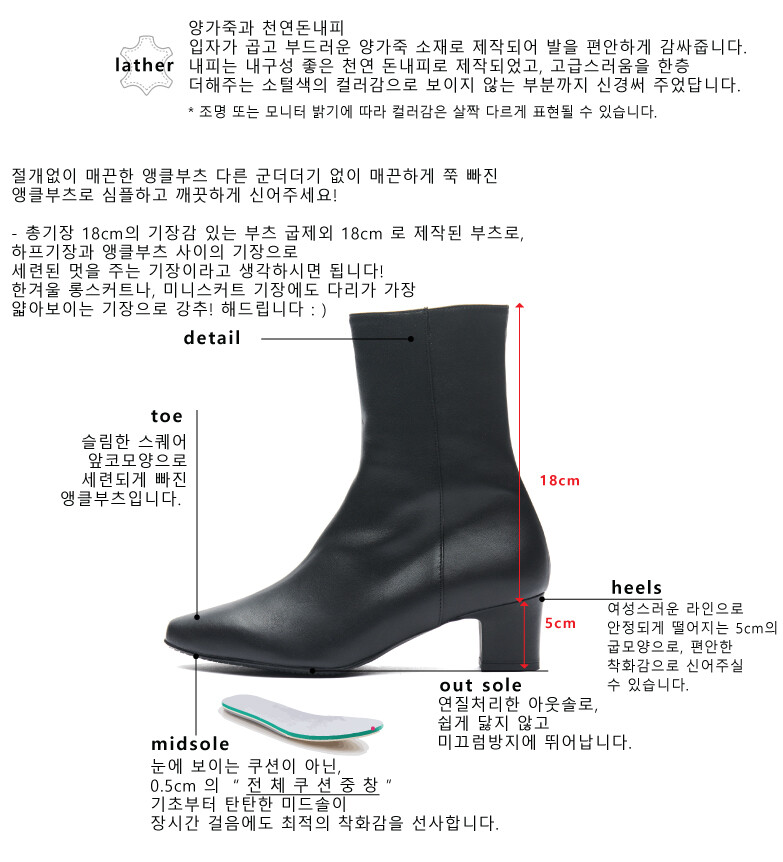 COMMENT 슬림라인으로 멋스럽고, 안정된 굽으로 편안하게 신으실 수 있는 부츠를 소개해드립니다! 입자가 곱고 부드러운 양가죽 소재로 제작되어 발을 편안하게 감싸줍니다. 내피는 내구성 좋은 천연 돈내피로 제작되었고, 고급스러움을 한층 더해주는 소털색의 컬러감으로 보이지 않는 부분까지 신경써 주었답니다. 슬림한 스퀘어 앞코모양 세련되게 빠진 앞코모양으로 제작된 앵클부츠입니다. 절개없이 매끈한 앵클부츠 다른 군더더기 없이 매끈하게 쭉 빠진 앵클부츠로 심플하고 깨끗하게 신어주세요! 총기장 18cm의 기장감 있는 부츠 굽제외 18cm 로 제작된 부츠로, 하프기장과 앵클부츠 사이의 기장으로 세련된 멋을 주는 기장이라고 생각하시면 됩니다! 한겨울 롱스커트나, 미니스커트 기장에도 다리가 가장 얇아보이는 기장으로 강추! 해드립니다 : ) 여성스러운 라인으로 안정되게 떨어지는 5cm의 굽모양으로, 편안한 착화감으로 신어주실 수 있습니다. 연질처리한 아웃솔로, 쉽게 닳지 않고 미끄럼방지에 뛰어납니다.
