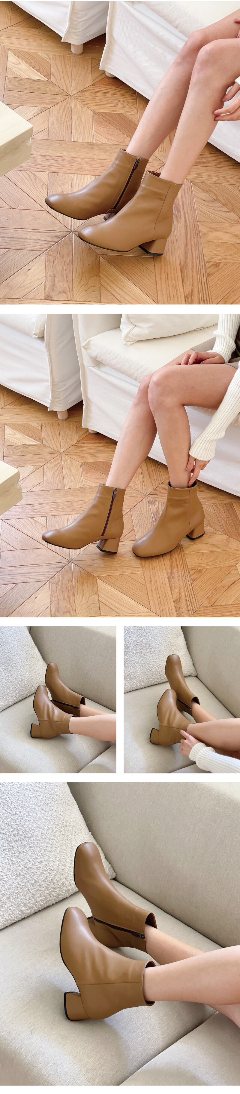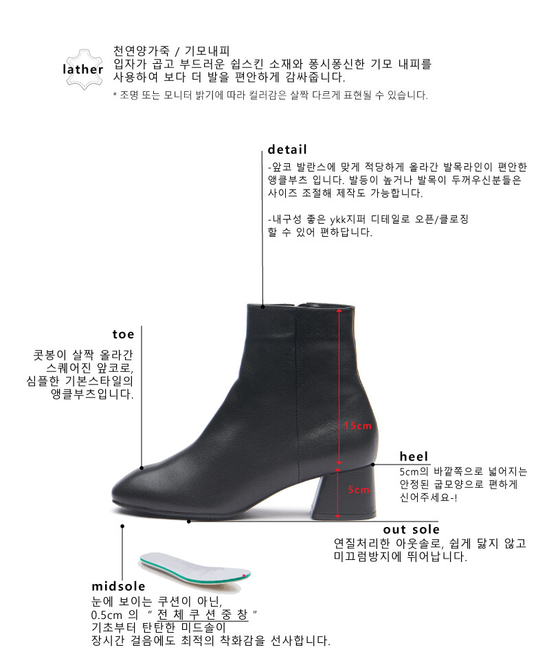 COMMENT 부드러운 쉽스킨 소재의 앵클부츠를 소개합니다. 입자가 곱고 부드러운 쉽스킨 소재와 퐁시퐁신한 기모 내피를 사용하여 보다 더 발을 편안하게 감싸줍니다. 콧봉이 살짝 올라간 스퀘어진 앞코로, 심플한 기본스타일의 앵클부츠입니다. 부츠 총기장(굽 제외) 기본이 되는 길이, 15cm 앵클부츠입니다.(*235사이즈 기준이므로 약간의 오차는 있을 수 있으니 참고해 주세요.) 앞코 발란스에 맞게 적당하게 올라간 발목라인이 편안한 앵클부츠 입니다. 발등이 높거나 발목이 두꺼우신분들은 사이즈 조절해 제작도 가능합니다. 내구성 좋은 ykk지퍼 디테일로 오픈/클로징 할 수 있어 편하답니다. 5cm의 바깥쪽으로 넓어지는 안정된 굽모양으로 편하게 신어주세요-! 연질처리한 아웃솔로, 쉽게 닳지 않고 미끄럼방지에 뛰어납니다.