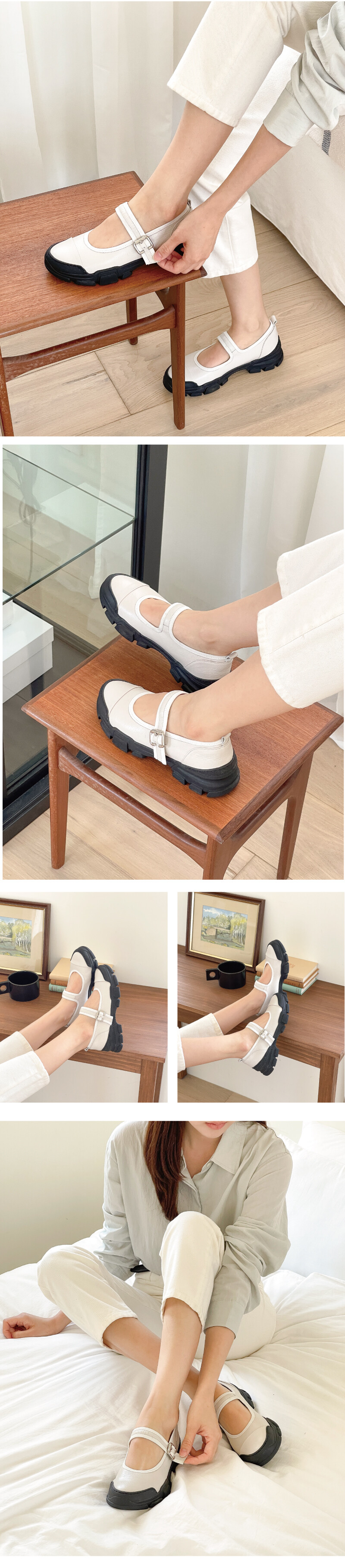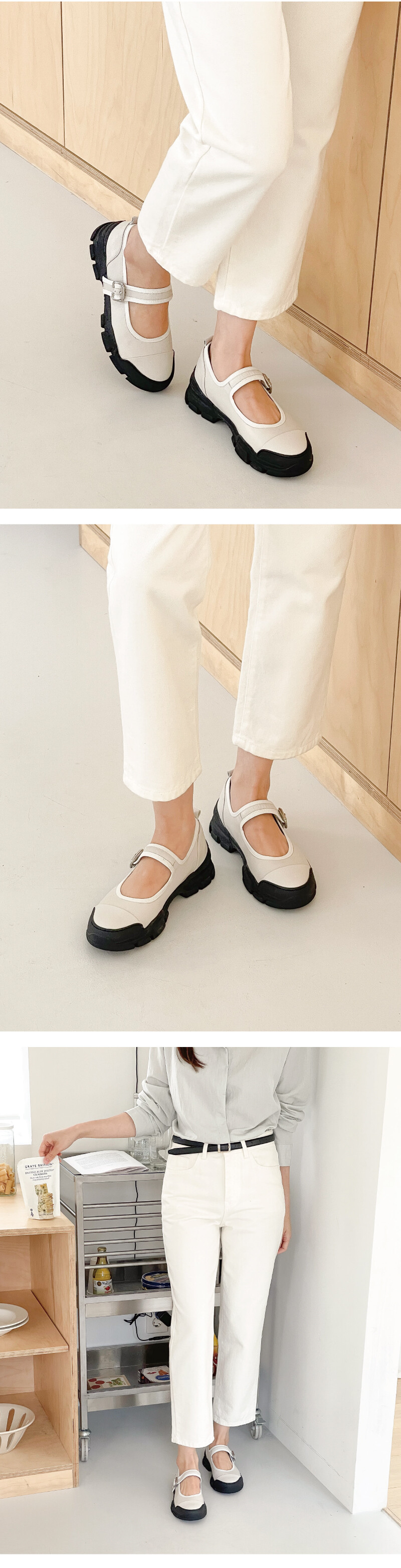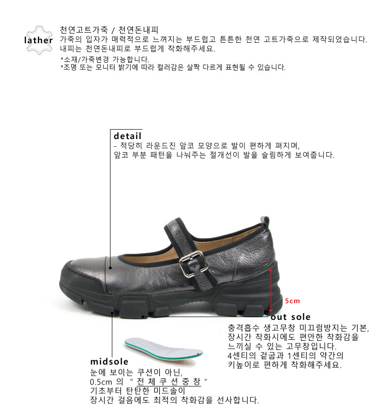 COMMENT 발등 스트랩이 안정적으로 잡아주는 메리제인 스니커즈를 소개해드려요! 착화감이 부드러우면서도 단단한 천연 고트 가죽과 내구성 좋은 천연돈내피로 제작되었습니다. 라운드진 앞코 모양으로 발이 편하게 펴지며, 앞코 부분 패턴을 나눠주는 절개선이 발을 슬림하게 보여줍니다. 두께감이 있는 발등 스트랩이 발을 편히 잡아주며, 벨트 안쪽은 히든밴딩처리로 터치 없이 편하게 신어주실 수 있습니다. 가죽 끝 마무리는 밴딩천으로 깔끔한 마무리를 해주었습니다. 충격흡수 생고무창 미끄럼방지는 기본, 장시간 착화시에도 편안한 착화감을 느끼실 수 있는 고무창입니다. 4센티의 겉굽과 1센티의 약간의 키높이로 편하게 착화해주세요.