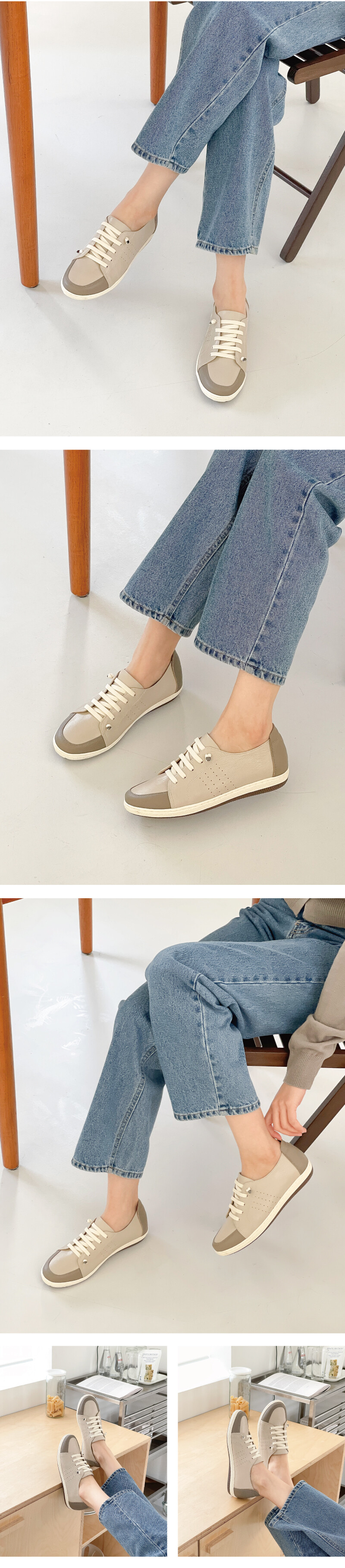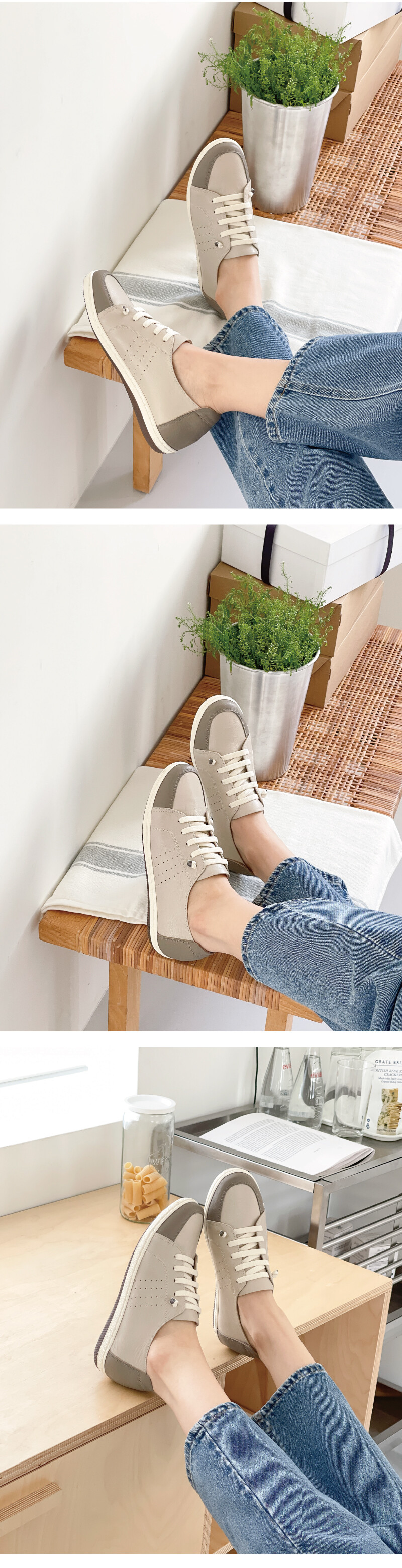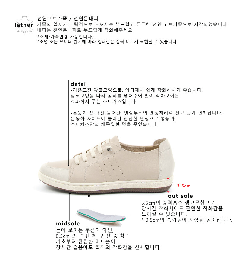 COMMENT 발등 밴딩처리로, 터치없이 편하게 신을 수 있는 스니커즈를 소개해드려요 : ) ! 가죽의 입자가 매력적으로 느껴지는 부드럽고 튼튼한 천연 고트가죽으로 제작되었습니다. 내피는 천연돈내피로 부드럽게 착화해주세요. 라운드진 앞코모양으로, 어디에나 쉽게 착화하시기 좋습니다. 앞코모양을 따라 콤비를 넣어주어 발이 작아보이는 효과까지 주는 스니커즈입니다. 운동화 끈 대신 들어간, 빗살무늬의 밴딩처리로 신고 벗기 편하답니다. 운동화 사이드에 들어간 잔잔한 펀칭으로 통풍과, 스니커즈만의 캐주얼한 멋을 주었습니다. 3.5cm의 충격흡수 생고무창으로 장시간 착화시에도 편안한 착화감을 느끼실 수 있습니다. * 0.5cm의 속키높이 포함된 높이입니다.