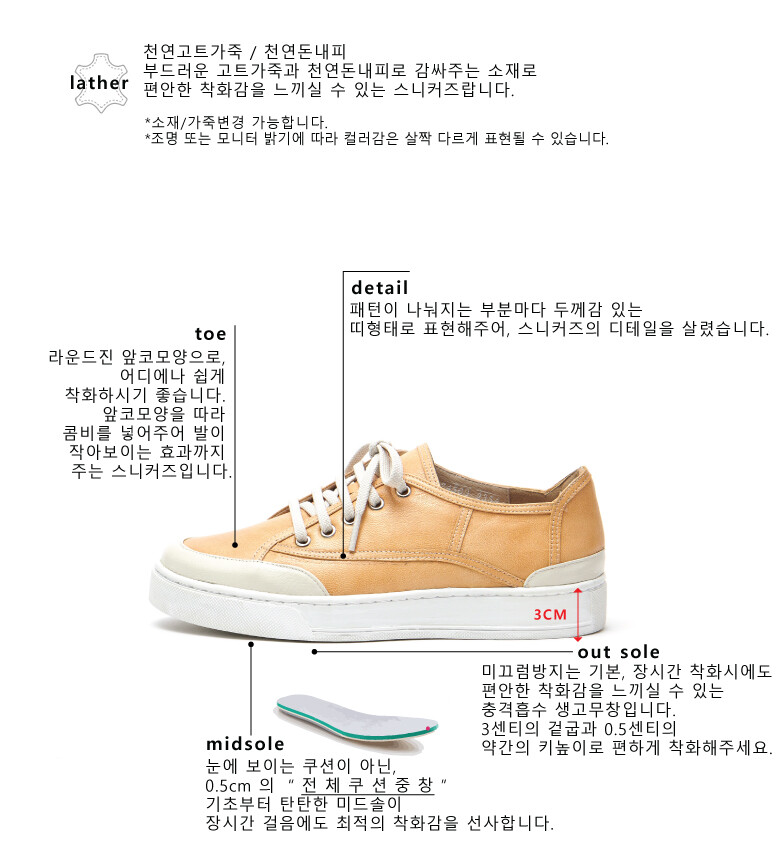 COMMENT 두께감이 있는 아웃솔로 특유의 캐주얼함이 돋보이는 매력적인 컬러들의 스니커즈를 소개해드려요! 부드러운 고트가죽과 천연돈내피로 감싸주는 소재로 편안한 착화감을 느끼실 수 있는 스니커즈랍니다. 라운드진 앞코모양으로, 어디에나 쉽게 착화하시기 좋습니다. 앞코모양을 따라 콤비를 넣어주어 발이 작아보이는 효과까지 주는 스니커즈입니다. 패턴이 나눠지는 부분마다 두께감 있는 띠형태로 표현해주어, 스니커즈의 디테일을 살렸습니다. 미끄럼방지는 기본, 장시간 착화시에도 편안한 착화감을 느끼실 수 있는 충격흡수 생고무창입니다. 3센티의 겉굽과 0.5센티의 약간의 키높이로 편하게 착화해주세요.