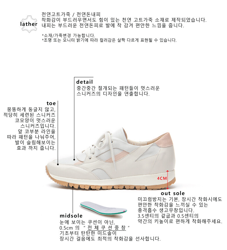 COMMENT 포인트 되는 색감과 패턴이 멋스러운 편안한 스니커즈를 소개해드려요! 착화감이 부드러우면서도 힘이 있는 천연 고트가죽 소재로 제작되었습니다. 내피는 부드러운 천연돈피로 발에 착 감겨 편안한 느낌을 줍니다. 뭉뚱하게 둥글지 않고, 적당히 세련된 스니커즈 코모양이 멋스러운 스니커즈입니다. 앞 코부분 라인을 따라 패턴을 나눠주어, 발이 슬림해보이는 효과 까지 줍니다. 중간중간 절개되는 패턴들이 멋스러운 스니커즈의 디자인을 연출합니다. 미끄럼방지는 기본, 장시간 착화시에도 편안한 착화감을 느끼실 수 있는 충격흡수 생고무창입니다. 3.5센티의 겉굽과 0.5센티의 약간의 키높이로 편하게 착화해주세요.