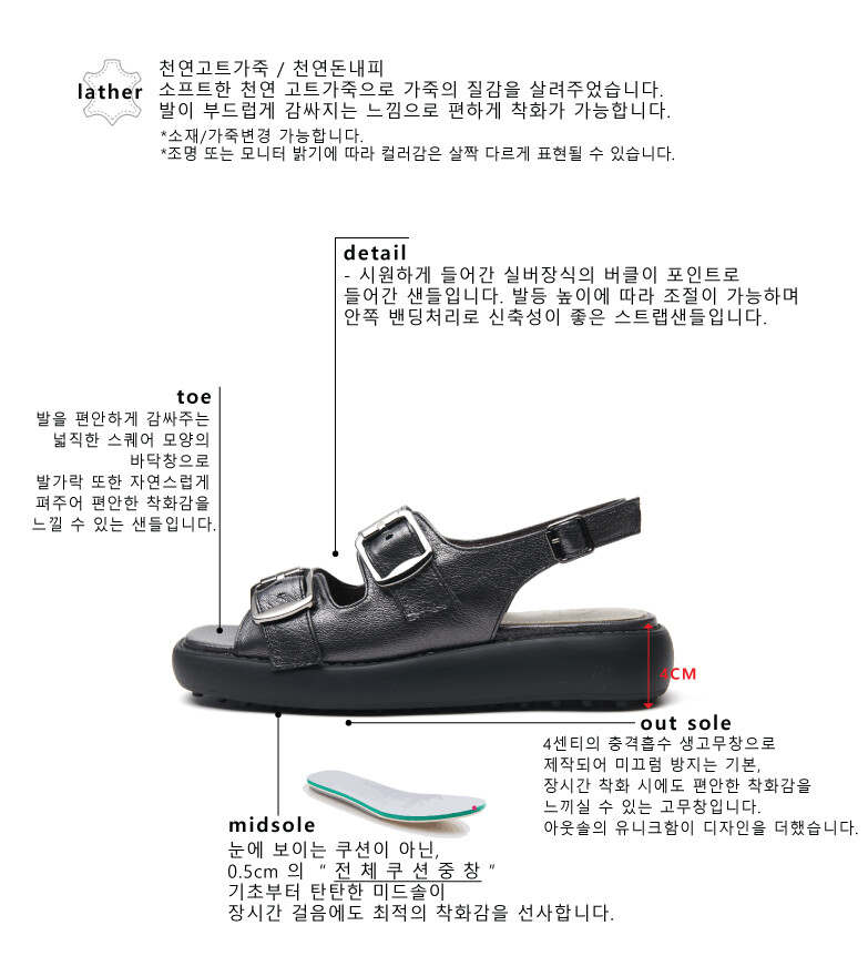 COMMENT 사각모양의 버클 장식이 포인트로 들어간 샌들 유니크한 아웃솔로 편하게 신어주세요! 양가죽보단 힘이 있고 소가죽보단 부드러운 천연고트가죽과 부드러운 가죽내피를 써주어 편안한 착화감을 느끼실 수 있습니다. 넓게 빠진 스퀘어 코모양으로 부담스럽지 않게 어디든 가볍게 신기 좋아요! 발을 편안하게 감싸주는 넓직한 라운드 모양의 바닥창으로 발가락 또한 자연스럽게 펴주어 편안한 착화감을 느낄 수 있는 샌들입니다. 시원하게 들어간 실버장식의 버클이 포인트로 들어간 샌들입니다. 발등 높이에 따라 조절이 가능하며 안쪽 밴딩처리로 신축성이 좋은 스트랩샌들입니다. 4센티의 충격흡수 생고무창 으로 제작되어 미끄럼 방지는 기본, 장시간 착화 시에도 편안한 착화감을 느끼실 수 있는 고무창입니다. 아웃솔의 유니크함이 디자인을 더했습니다.
