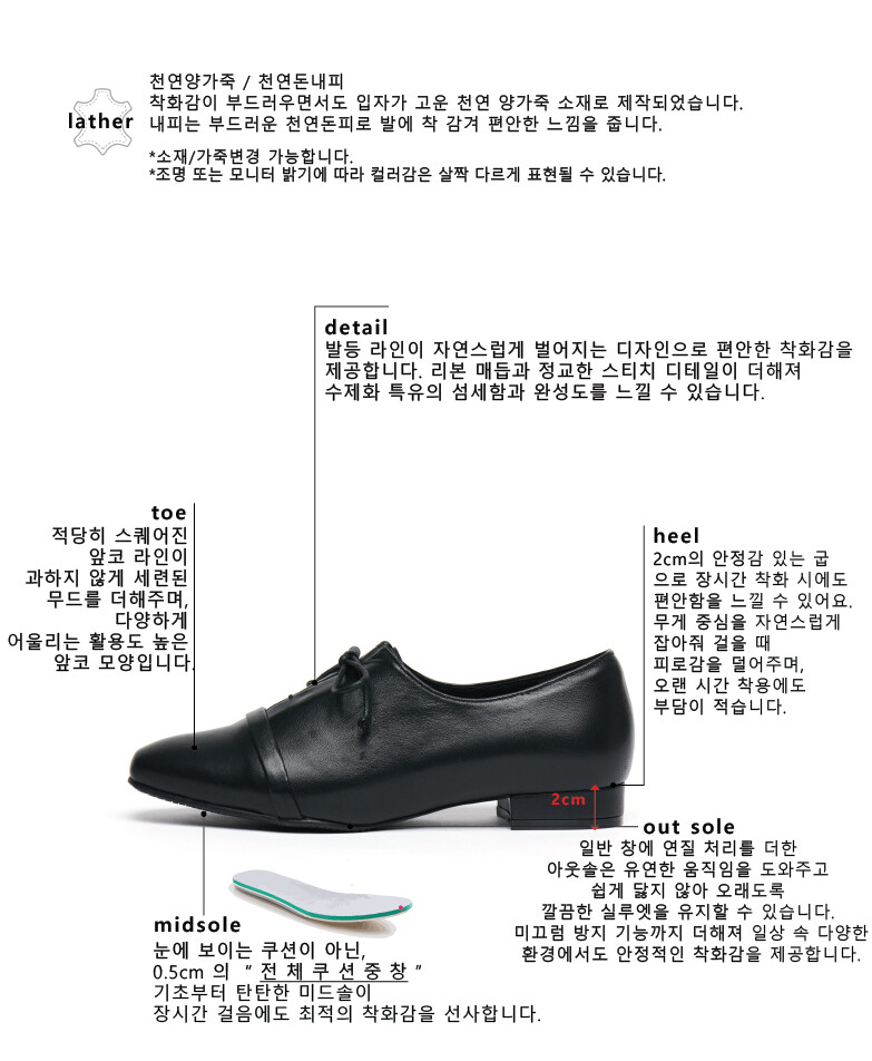 COMMENT 발등 라인이 자연스럽게 벌어지는 미니멀 디자인, 심플하면서도 세련된 분위기로 데일리하게 즐기기 좋은 로퍼를 소개해드려요! 착화감이 부드러우면서도 입자가 고운 천연 양가죽 소재로 제작되었습니다. 내피는 부드러운 천연돈피로 발에 착 감겨 편안한 느낌을 줍니다. 적당히 스퀘어진 앞코 라인이 과하지 않게 세련된 무드를 더해주며, 다양하게 어울리는 활용도 높은 앞코 모양입니다. 발등 라인이 자연스럽게 벌어지는 디자인으로 편안한 착화감을 제공합니다. 리본 매듭과 정교한 스티치 디테일이 더해져 수제화 특유의 섬세함과 완성도를 느낄 수 있습니다. 2cm의 안정감 있는 굽으로 장시간 착화 시에도 편안함을 느낄 수 있어요. 무게 중심을 자연스럽게 잡아줘 걸을 때 피로감을 덜어주며, 오랜 시간 착용에도 부담이 적습니다. 일반 창에 연질 처리를 더한 아웃솔은 유연한 움직임을 도와주고 쉽게 닳지 않아 오래도록 깔끔한 실루엣을 유지할 수 있습니다. 미끄럼 방지 기능까지 더해져 일상 속 다양한 환경에서도 안정적인 착화감을 제공합니다.