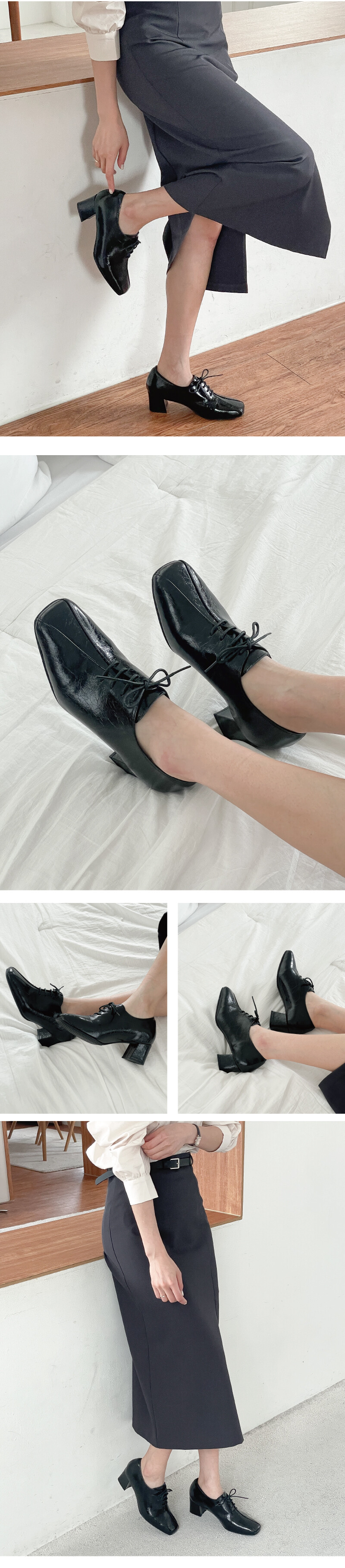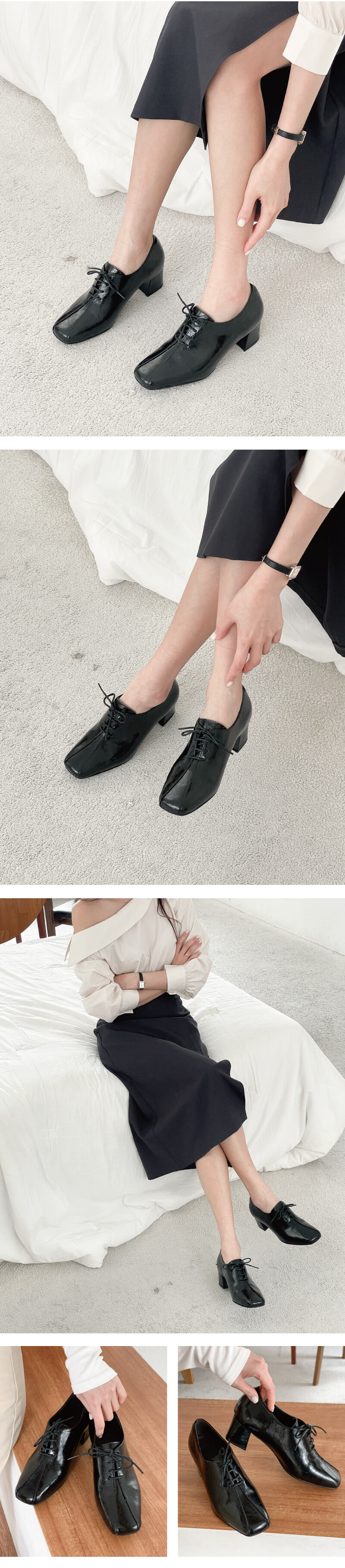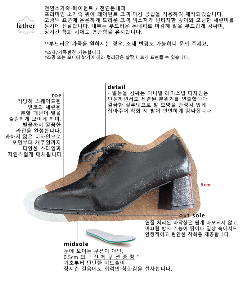 COMMENT 광택 속에 숨은 균열이 만들어낸 모던한 매력적인 로퍼를 소개해드려요. 프리미엄 소가죽 위에 페이턴트 크랙 마감 공법을 적용하여 제작되었습니다. 고광택 표면에 은은하게 드리운 크랙 텍스처가 빈티지한 깊이와 모던한 세련미를 동시에 전달합니다. 내부는 부드러운 돈내피로 마감해 발을 부드럽게 감싸며, 장시간 착화 시에도 편안함을 유지합니다. **부드러운 가죽을 원하시는 경우, 소재 변경도 가능하니 문의 주세요. 적당히 스퀘어드된 앞코와 세련된 분할 패턴이 발을 슬림하게 보이게 하며, 발끝까지 깔끔한 라인을 완성합니다. 과하지 않은 디자인으로 포멀부터 캐주얼까지 다양한 스타일과 자연스럽게 매치됩니다. 발등을 감싸는 미니멀 레이스업 디자인은 단정하면서도 세련된 분위기를 연출합니다. 깔끔한 실루엣으로 발 모양을 안정감 있게 잡아주어 착화 시 발이 편안하게 감싸집니다. 5cm 청키 힐은 시각적으로 다리를 길고 날씬하게 만들어 주면서, 안정감 있는 착화감을 제공합니다. 장시간 착용해도 발목과 발에 부담이 적어 편안하게 걸을 수 있습니다. 연질 처리된 바닥창은 쉽게 마모되지 않고, 미끄럼 방지 기능이 뛰어나 일상 속에서도 안정적이고 편안한 착화를 제공합니다.