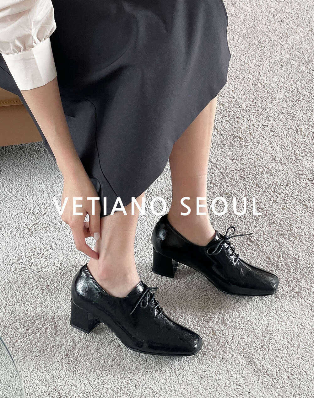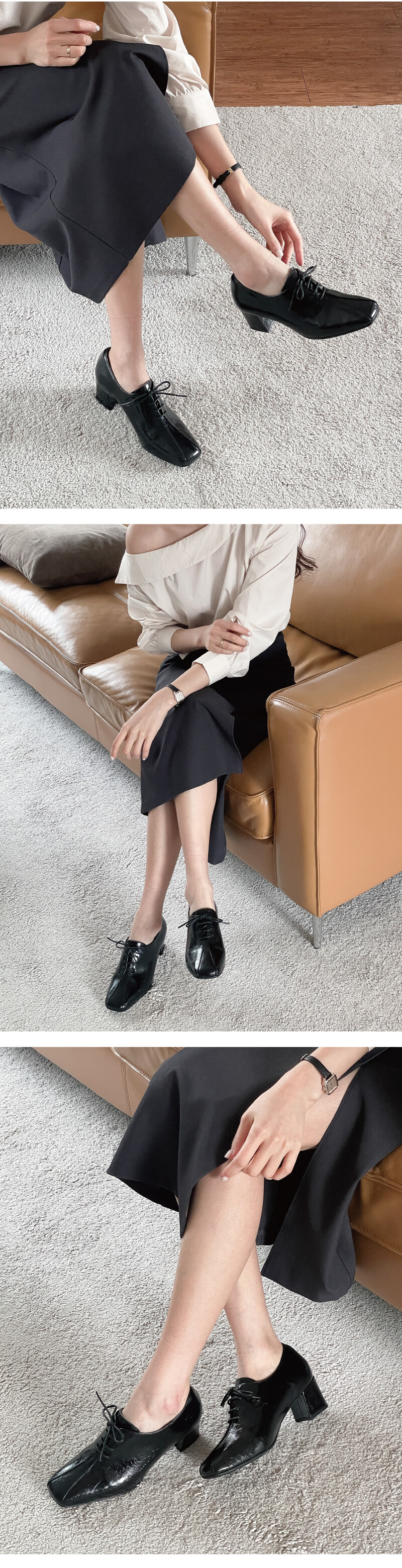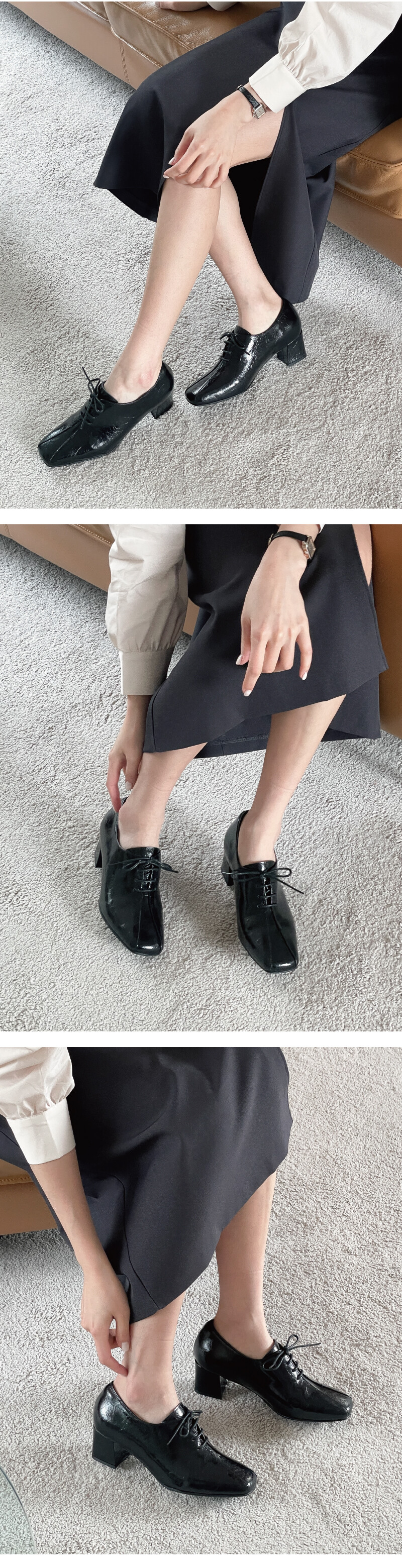 COMMENT 광택 속에 숨은 균열이 만들어낸 모던한 매력적인 로퍼를 소개해드려요. 프리미엄 소가죽 위에 페이턴트 크랙 마감 공법을 적용하여 제작되었습니다. 고광택 표면에 은은하게 드리운 크랙 텍스처가 빈티지한 깊이와 모던한 세련미를 동시에 전달합니다. 내부는 부드러운 돈내피로 마감해 발을 부드럽게 감싸며, 장시간 착화 시에도 편안함을 유지합니다. **부드러운 가죽을 원하시는 경우, 소재 변경도 가능하니 문의 주세요. 적당히 스퀘어드된 앞코와 세련된 분할 패턴이 발을 슬림하게 보이게 하며, 발끝까지 깔끔한 라인을 완성합니다. 과하지 않은 디자인으로 포멀부터 캐주얼까지 다양한 스타일과 자연스럽게 매치됩니다. 발등을 감싸는 미니멀 레이스업 디자인은 단정하면서도 세련된 분위기를 연출합니다. 깔끔한 실루엣으로 발 모양을 안정감 있게 잡아주어 착화 시 발이 편안하게 감싸집니다. 5cm 청키 힐은 시각적으로 다리를 길고 날씬하게 만들어 주면서, 안정감 있는 착화감을 제공합니다. 장시간 착용해도 발목과 발에 부담이 적어 편안하게 걸을 수 있습니다. 연질 처리된 바닥창은 쉽게 마모되지 않고, 미끄럼 방지 기능이 뛰어나 일상 속에서도 안정적이고 편안한 착화를 제공합니다.